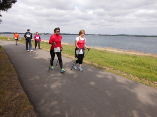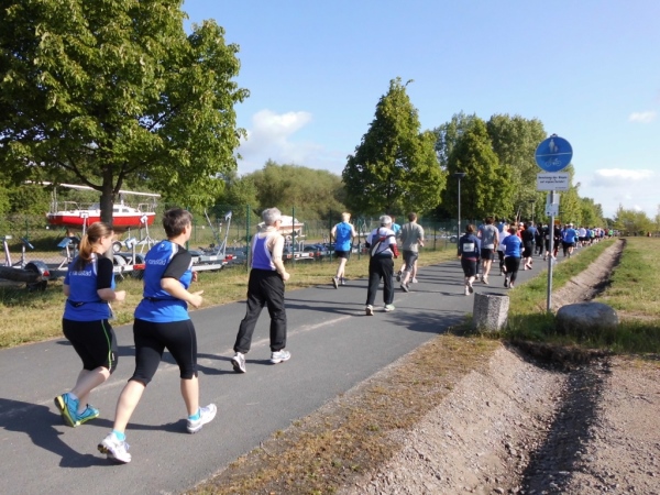 Schon bei Kilometer 7 kehrt Leben auf die Strecke zurück. Die Stockenten biegen ein. Man verzeihe mir diesen Ausdruck, aber eine ehemalige Lauffreundin von mir läuft jetzt auch am Stock. Und zu ihr darf ich auch Stockente sagen. Aber wie dem auch sei, so plötzlich wie die Walker auftauchten, so schnell sind sie auch wieder verschwunden, noch vor Kilometer 8.