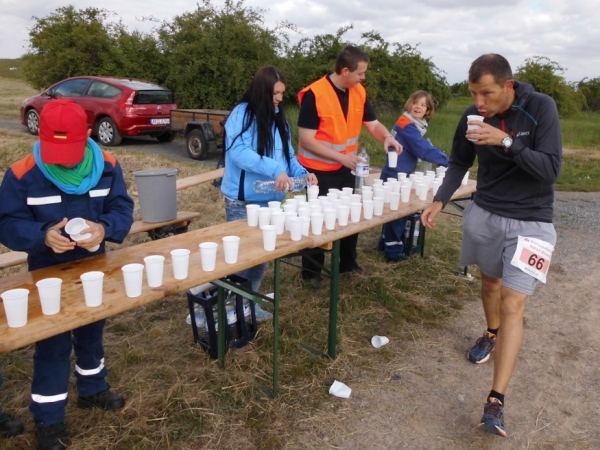 Die ersten Kilometer laufen wir auf dem asphaltierten Rad- und Wanderweg entlang des Sees Richtung Pouch. Vor den Wochenendhäuschen werden wir bejubelt, das brauche ich heute besonders. Ich wundere mich etwas, dass ich trotz häufiger Fotostopps nicht die symbolische rote Laterne in die Hand gedrückt bekomme. Zwanzig, dreißig Läufer bleiben konstant hinter mir. Bin ich etwa gut?