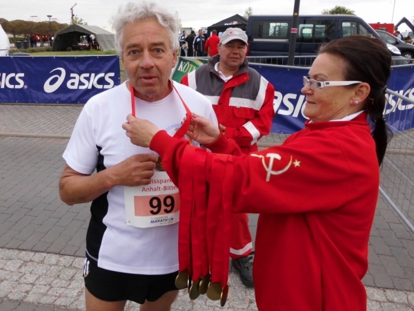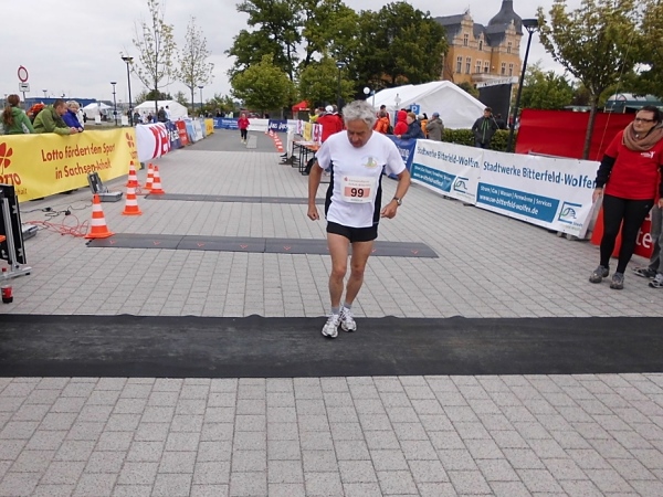Kilometer 39. Die Goitzsche ist wieder erreicht, ich sehe schon das Ziel. Oder besser gesagt, ich sehe die Villa am Bernsteinsee. Ganz klein, ganz weit weg, ganz in der Ferne. Hätte ich bei anderen Läufen gesagt. Heute denke ich: nur noch mickrige drei Kilometer. Die ziehe ich auch noch durch, der Zielsprecher kündigt mich an: Jetzt kommt Günter Schmidt, gestartet für Marathon4you, seine Zeit: 4.46:30… Dann macht er eine Pause - und dann legt er verdutzt nach: Günter Schmidt ist eine Dreiviertelstunde schneller als vor einem Jahr!