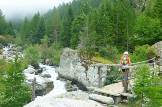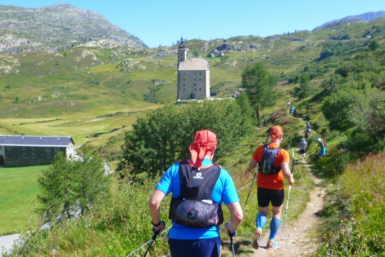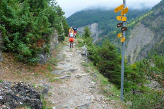 Ein bisschen ärgere ich mich schon darüber, dass wir keinen Mitstreiter mehr einholen können. Da hilft auch der Straßendownhill nicht weiter. Bei km 30 ist der Trennungspunkt von Marathonis und den Runnern, die heute 28 km laufen, erreicht. Wer hier nicht mehr fit wirkt, muss auf die Talstrecke durch das Fort nach Gondo. Judith und mir geht es blendend, also dürfen wir noch mal 700 hm auf drei Kilometern nach oben. Diese Wegevariante wurde von Schmugglern benutzt, die nicht durch das enge Tal wollten.