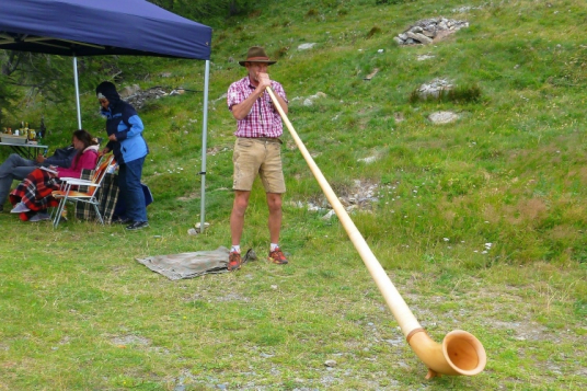 Schweißtreibend, wir steigen Richtung Seehorn und erreichen auf 1872 hm Furggu. Empfangen werden wir mit großem Hallo und einem Alphornbläser. Wirklich toll, was die Helfer hier so leisten. Einige sieht man an einem langen Tag sogar mehrmals. Und sie sind immer für ein Schwätzchen zu haben. Nur die Frage, wie viel Zeitabstand der Vordermann hat, ist trotz Liste nicht zu beantworten. Das wäre noch eine Optimierungsmöglichkeit. „So 15 Minuten“ bedeutet, das es schwierig wird, noch jemanden einzuholen.