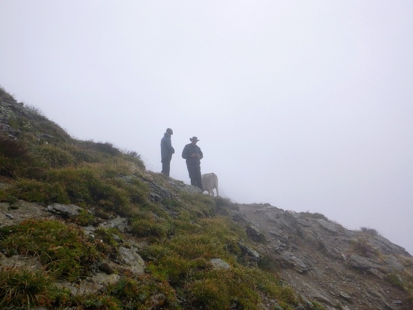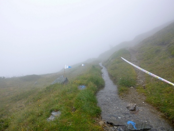 Auf der Passhöhe ging es dann auf einem wunderschönen Panoramaweg hinauf zum Bistinenpass (km 23,5/2417 m), leider heute total in den Wolken. Auf diesem Streckenabschnitt hatte ich deshalb auch nur einen Gedanken, möglichst schnell hinauf und auf der anderen Seite wieder hinunter, ohne mich im Nebel zu verlaufen. Hier oben wehte auch ein kalter Wind und die Luft war feucht vom Nebel, alles in allem sehr ungemütlich.