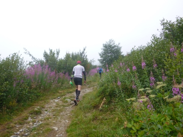 Leider hatte es die ganze Nacht geregnet und die Wolken hingen tief über dem Tal. Die Wetterprognosen waren eher schlecht, erst am Nachmittag war eine Besserung in Sicht. Egal, ich hatte bereits meine Regenjacke übergestreift und die Temperaturen waren trotz Regen angenehm. Brigitte Wolf, die Streckenchefin, erklärte uns noch einige Details zur Strecke und Streckenmarkierung und schickte uns dann pünktlich um 8 Uhr auf die Strecke.
