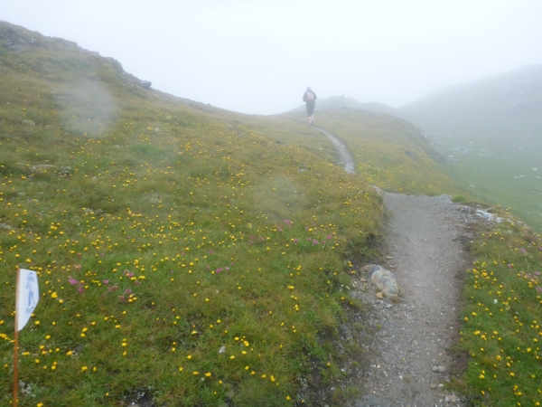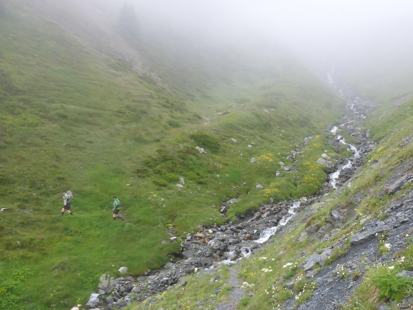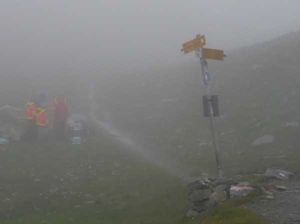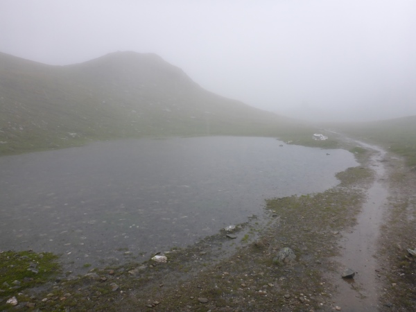 Schließlich taucht im Nebel vor mir ein kleiner See auf. Dahinter erkenne ich einige Leute, die in roten Jacken im Regen ausharren, um uns Läufer zu versorgen. Der 2417 m hohe Bistinenpass ist erreicht. Mehr als die Hälfte der Tagesetappe liegt nun hinter mir und fast nur noch Abstieg vor mir.