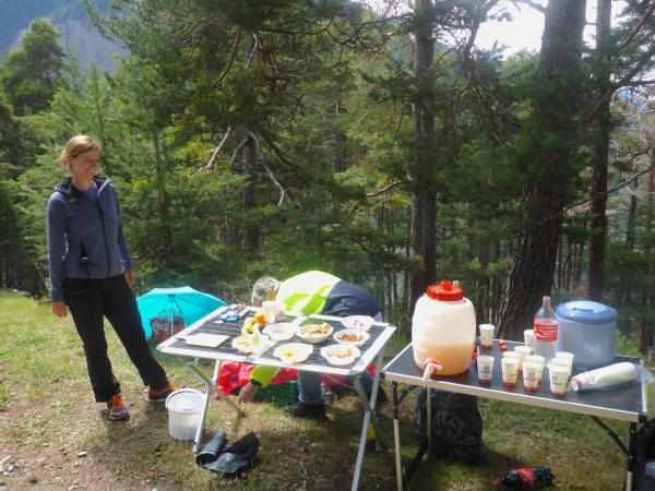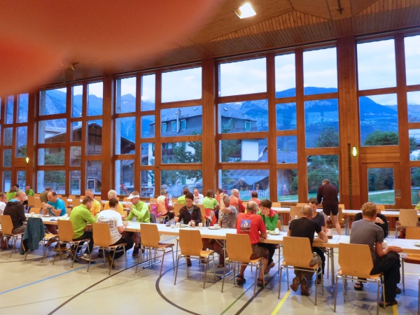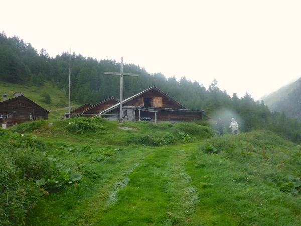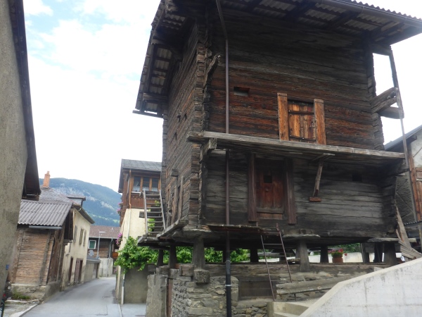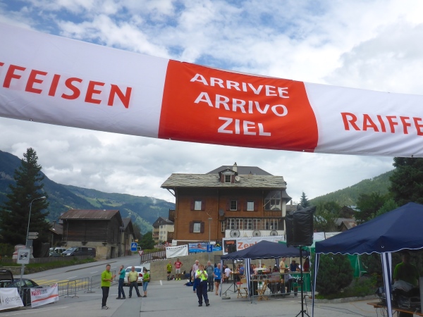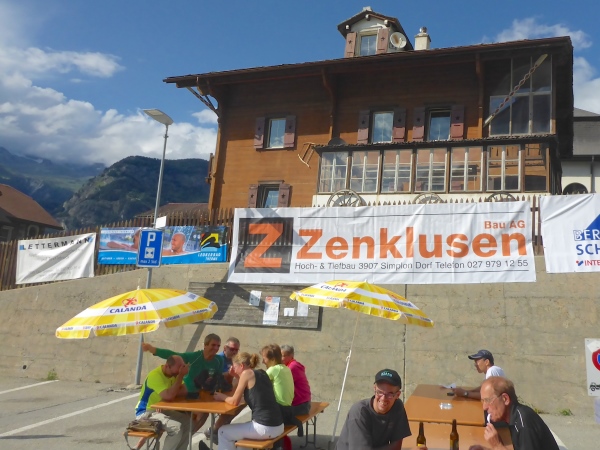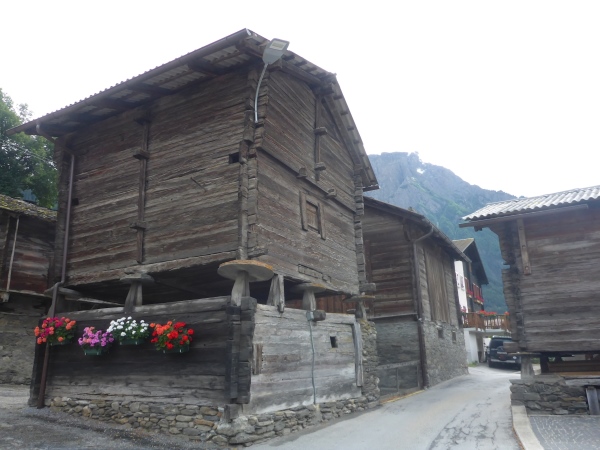 In Brig Ried stehen viele der typischen Walliser Speicherhäuser, die auf Stelzen gebaut und unten mit großen Steinplatten versehen sind, damit Mäuse nicht hinein kommen. Im Zielbereich ist ein Stand, an dem man Getränke sowie Würstchen mit Brot kaufen kann, um die Zeit bis zum Abendessen zu überbrücken. Viele von uns legen ihre Klamotten und Schuhe zum Trocknen in die inzwischen heiß vom Himmel knallende Sonne.