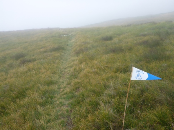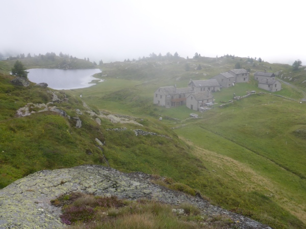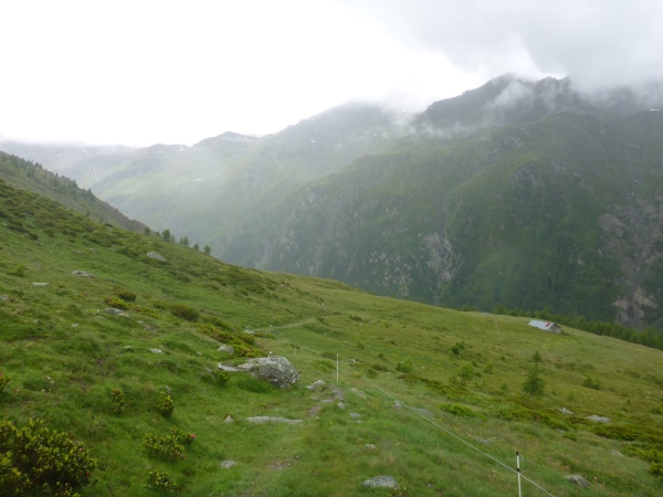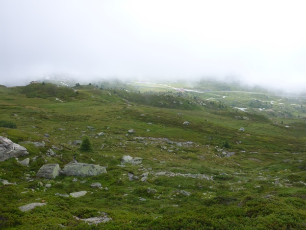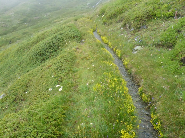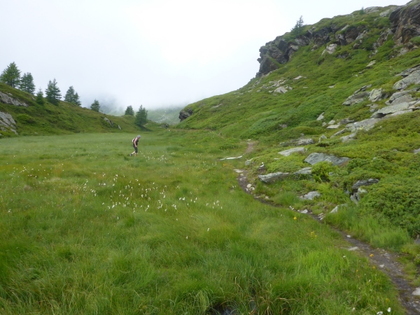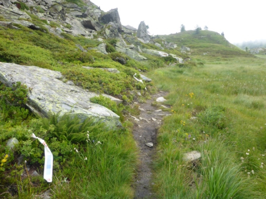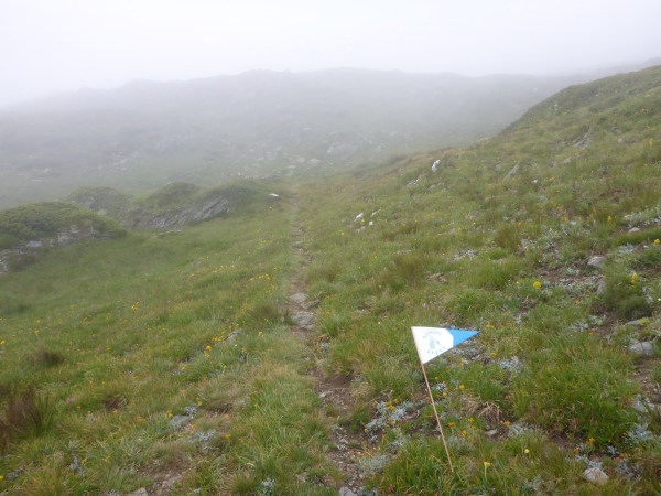 Nun verlassen wir für heute den Stockalperweg. Gleich nach Aufbruch vom Pass laufen wir ein kurzes Stück durch ein Sumpfgebiet. Hier bleiben keine Schuhe trocken. Dann steigen wir hinauf in den Nebel. Eintöniges Grau ist um rund um uns, einzige Farbtupfer sind die vielen blühenden Blumen. Für einen kurzen Moment reißt unter uns die Wolkendecke auf und ich blicke hinab zum Pass. Dann marschiere ich wieder durch den Nebel bergauf. Der Weg wird immer schmaler, manchmal sehen wir nur noch Wegspuren. Aber die Orientierung ist völlig problemlos, denn selbst in dichtem Nebel sehen wir an kritischen Stellen in dichtem Abstand Fähnchen vor uns. Nur der Regen nervt allmählich..