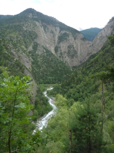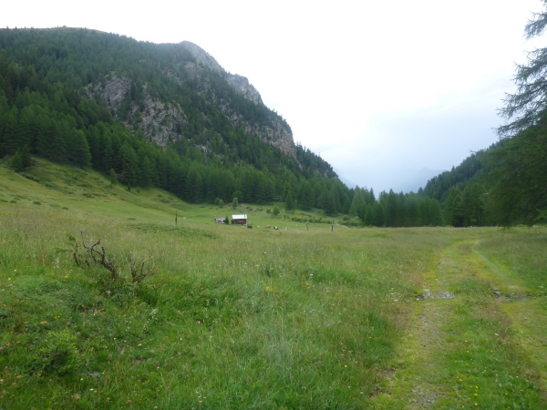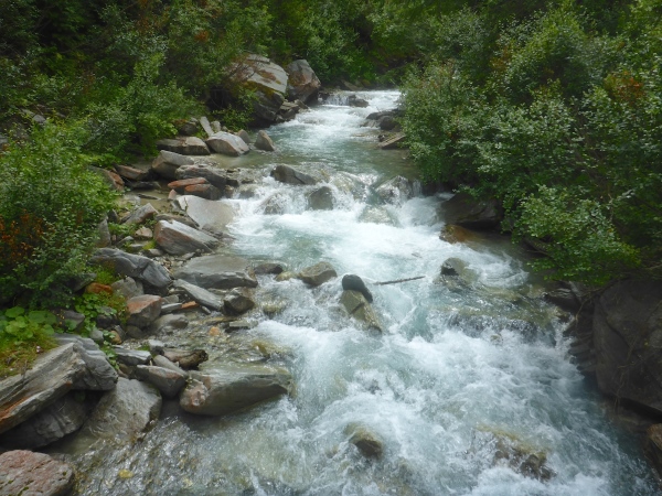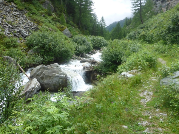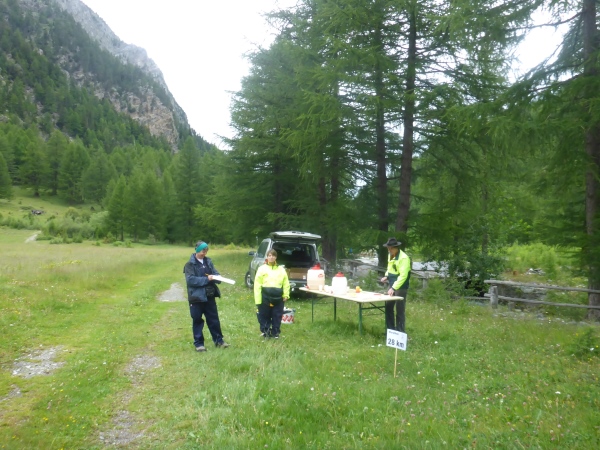 Etwa 700 Höhenmeter unter dem Pass ist bei der Nidrist Alpe (km 28,7) die nächste Verpflegungsstelle. Nach kurzem Plaudern mit den netten Leuten dort laufe ich neben dem rauschenden Gamsa-Bach weiter bergab. Dann scheint plötzlich auch noch die Sonne - welch ungewohntes Gefühl! Nun macht das Laufen gleich doppelt so viel Spaß!