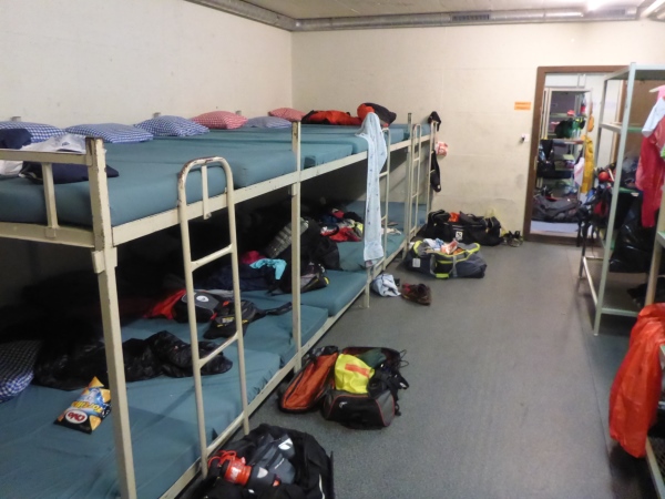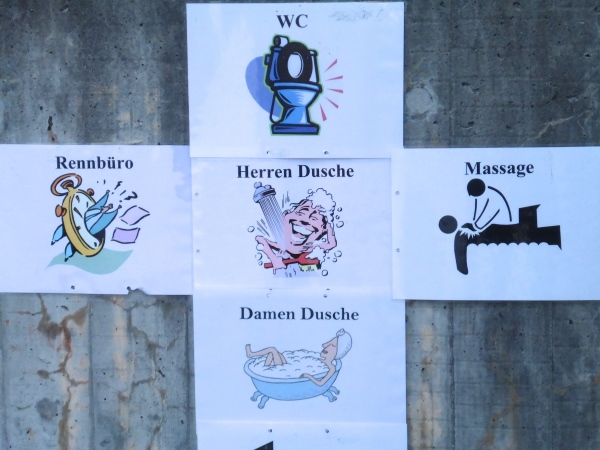 Wir übernachten im Schutzraum. Die Belüftung hört sich nach Sturm mit Starkregen an. Einige Läufer verziehen sich ins Schulhaus, zwei legen sich vor den Eingang und schlafen an der frischen Luft. Witzig finde ich unterschiedlichen Icons für die Duschen der Männer und der Frauen.