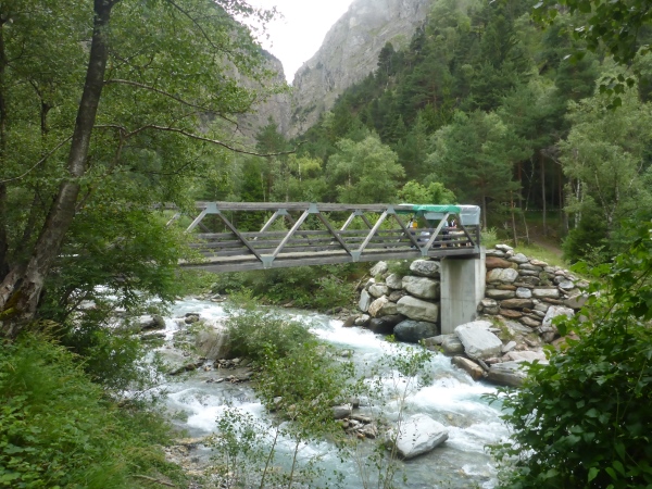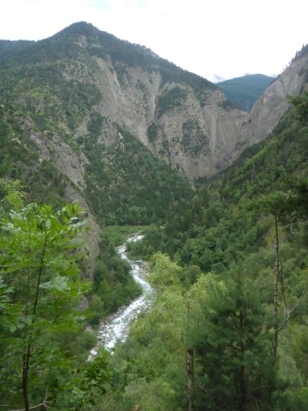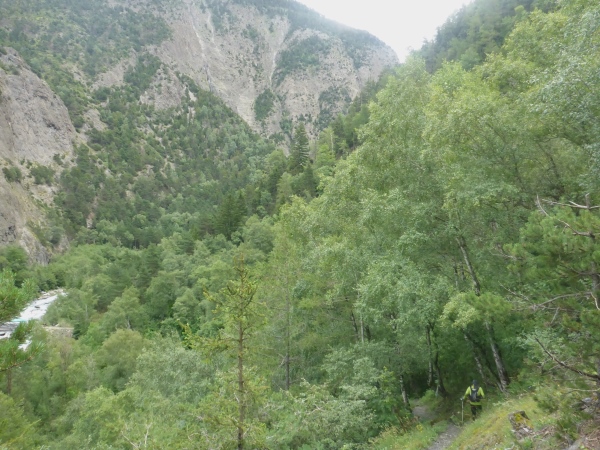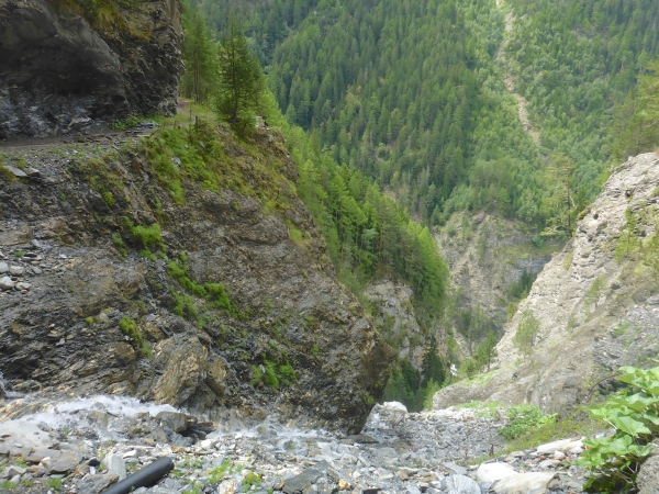 Unser Ziel in Brig Ried liegt etwas oberhalb der Stadt und ist Luftlinie nun nicht mehr weit von mir entfernt. Es scheint so, als wäre ich bald dort. Doch dann muss ich überraschend wieder bergauf marschieren. Erst nach einigem nervenden Aufstieg führt ein Trail hinab zur Saltina-Schlucht. Mehr als 100 Höhenmeter laufen wir nun sehr steil hinab. Wie erwartet, dürfen wir unten nicht zu Fuß durch die Saltina waten, was ansonsten fester Programmpunkt ist beim Gondo Event. Aber nach den starken Regenfällen der letzten Zeit ist die Strömung viel zu stark, so dass wir stattdessen über die Brücke müssen.