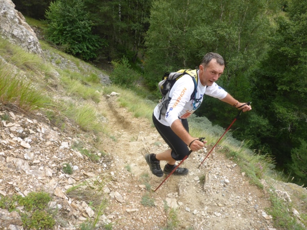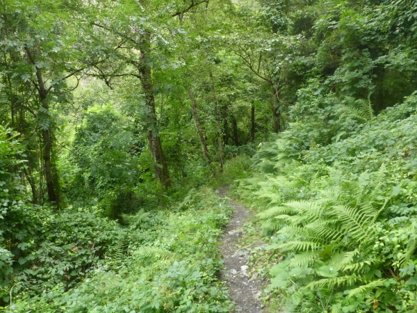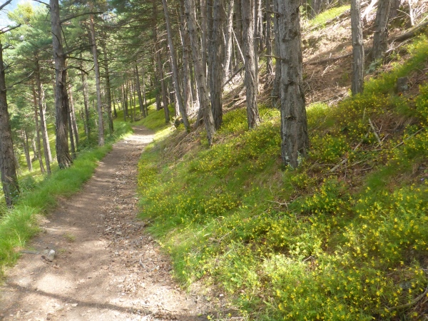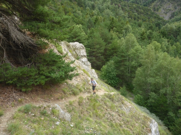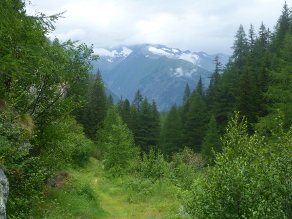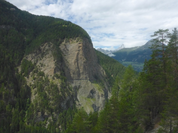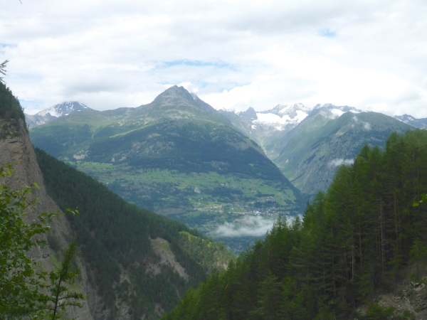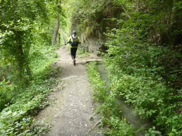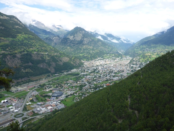 Ich habe irrtümlich das Höhendiagramm so in Erinnerung, dass ich nun nur noch 5 km bergab und danach 2 km aufsteigen muss. Entsprechend optimistisch sause ich bergab. Schon kurz nach der VP zweigt links unsere Route auf den nächsten Genusslauftrail durch den Wald ab. Schöne Blicke hinab ins Rhonetal und nach Brig erfreuen mich.