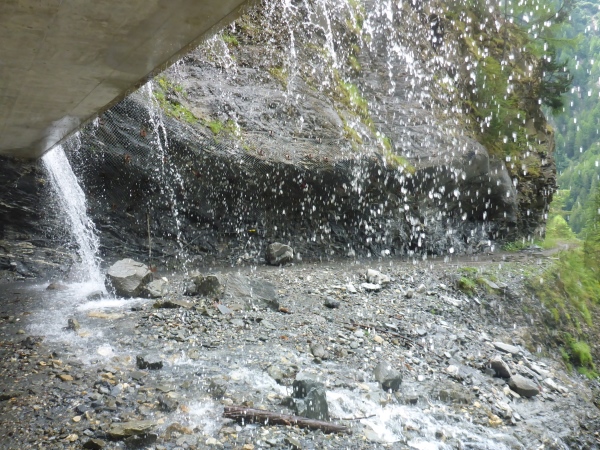 Später führt wieder ein herrlicher Trail durch Bergwald abwärts und gleich mehrmals unter einem Wasserfall hindurch. Klasse! Zwischendurch lädt ein befahrbarer Weg zum Beschleunigen ein. Dann treffe ich bei km 35 wieder einmal auf gut gelaunte Leute bei einer Verpflegungsstelle.