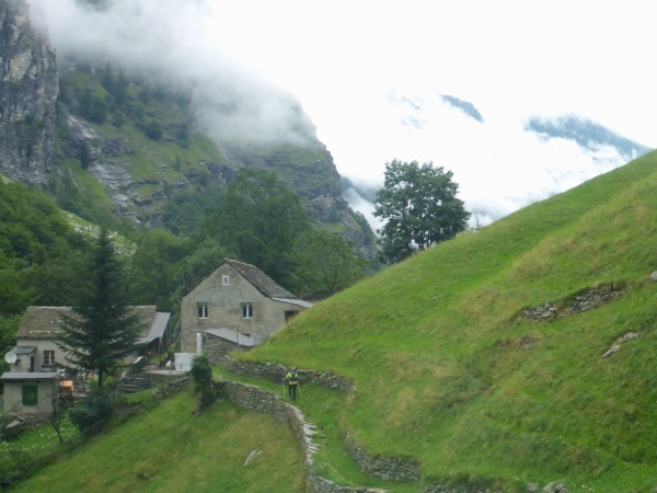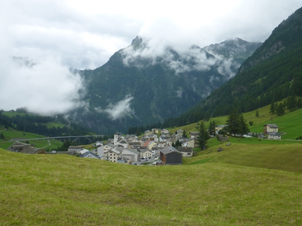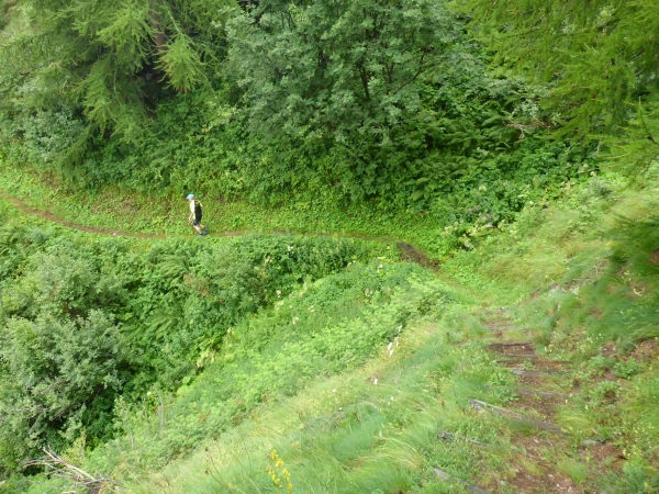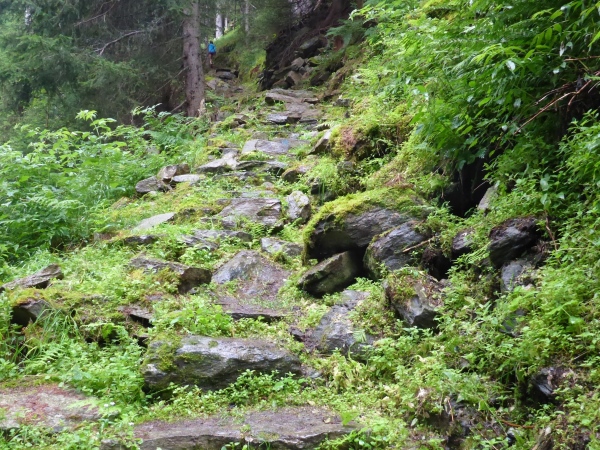 Noch einen Kilometer bis zum Ziel ist. Gestern kam kurz vor Schluss als Höhepunkt des Tages der steile Aufstieg, heute dagegen geht es auf den letzten tausend Metern sehr steil auf den alten Steinstufen des Stockalperwegs abwärts. Man muss höllisch aufpassen, auf den teilweise nassen und rutschigen Steinen so kurz vor dem Ziel nicht zu stürzen.