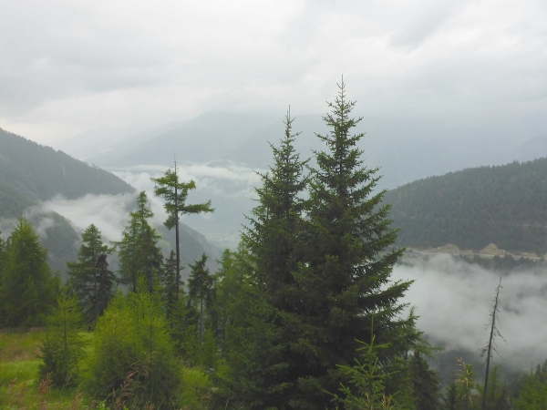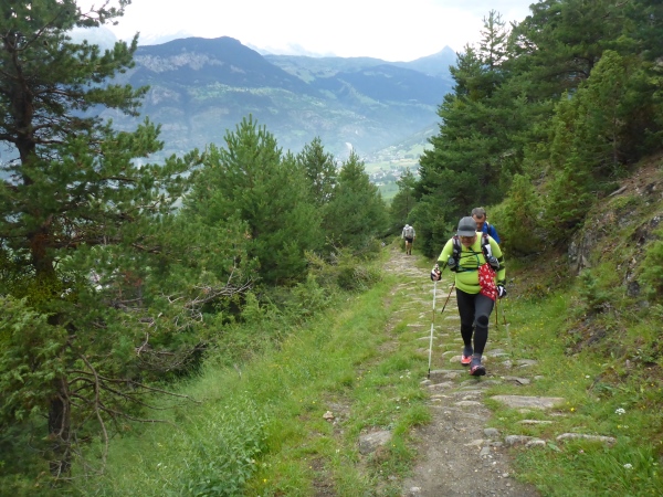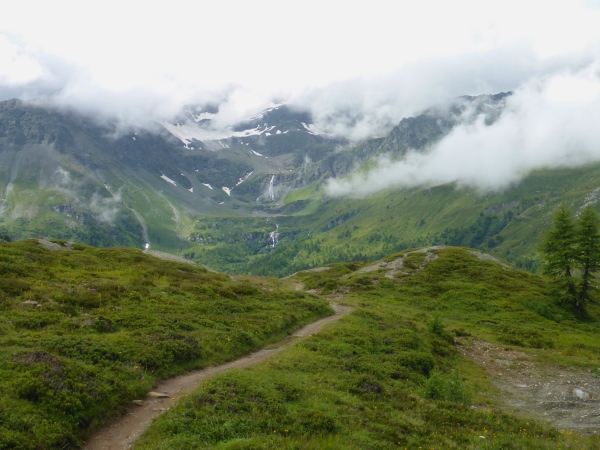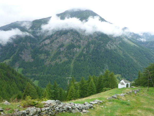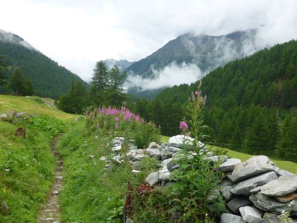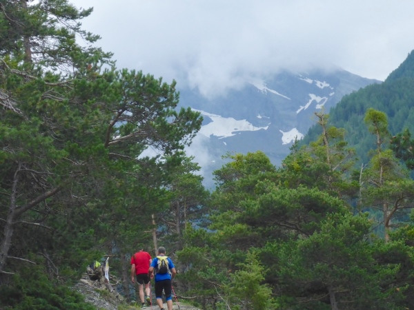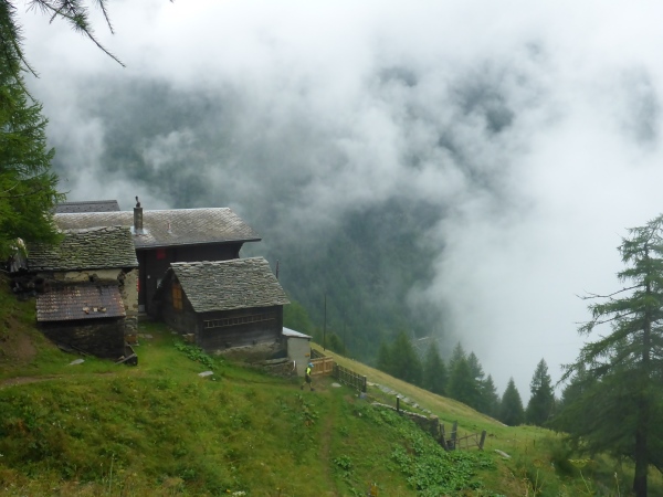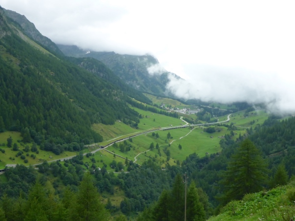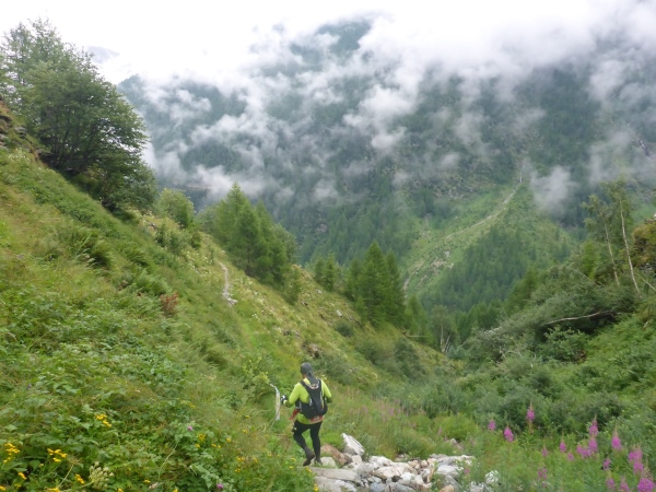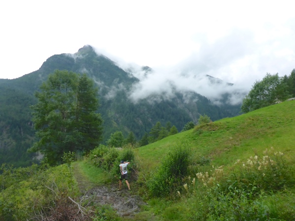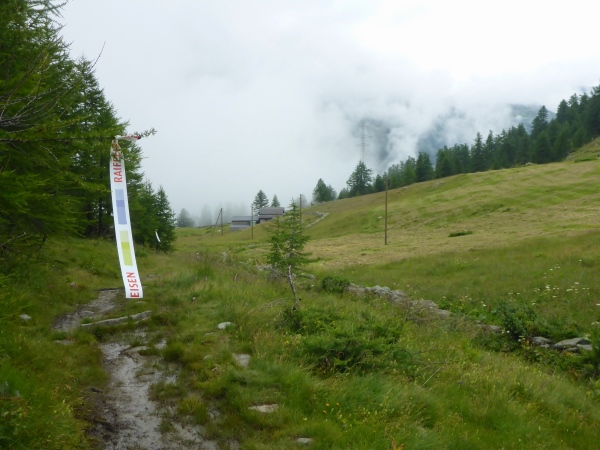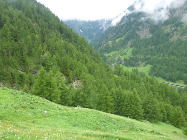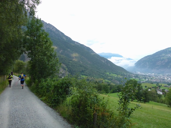 Ein paar hundert Meter weit müssen wir der Straße folgen, zum Glück nicht auf Asphalt sondern auf einem Pfad jenseits der Leitplanke. Nach der Verpflegungsstelle beim Gasthof Rothwald (km 12,7) laufen wir mehr als 200 Höhenmeter abwärts zum Tafernabach, wo wir wieder auf den Stockalperweg treffen, dem wir nun einige Stunden lang folgen können. Die Regenjacke kann ich nun wieder ausziehen, denn die Wolken über mir lichten sich. Nur von den Bergen auf der gegenüberliegenden Seite des Rhonetals sieht man jetzt gar nichts mehr. . Auch Teile unserer Aufstiegsstrecke stecken jetzt im Nebel. Da hatten wir heute Morgen Glück!