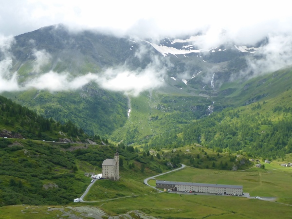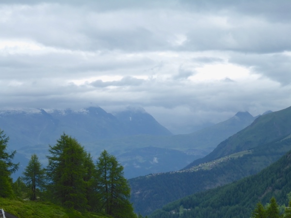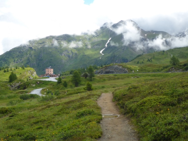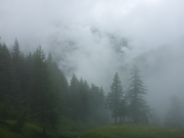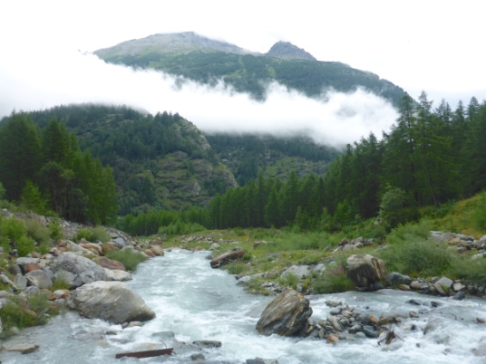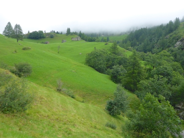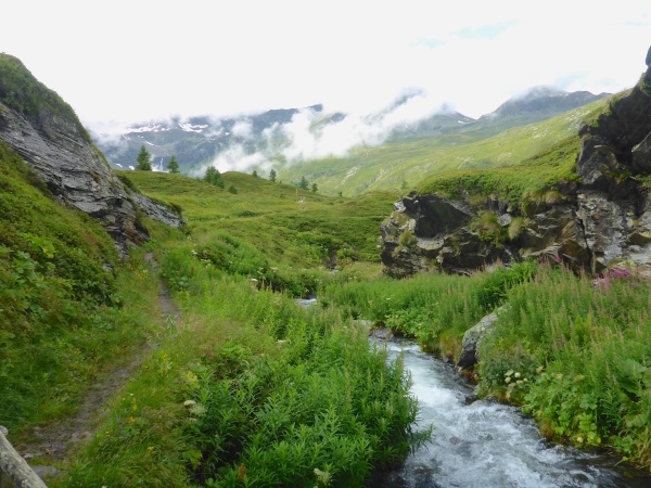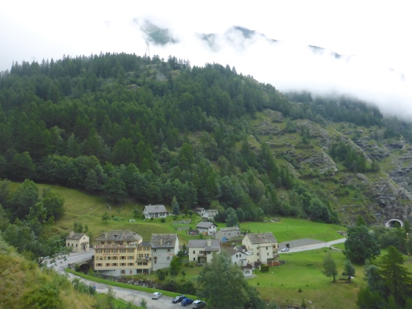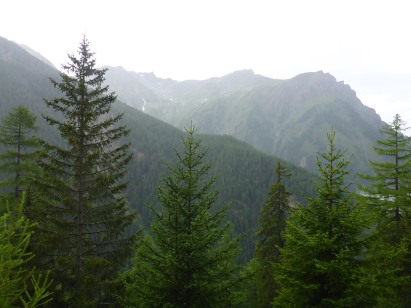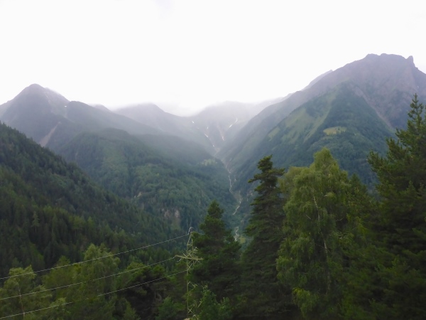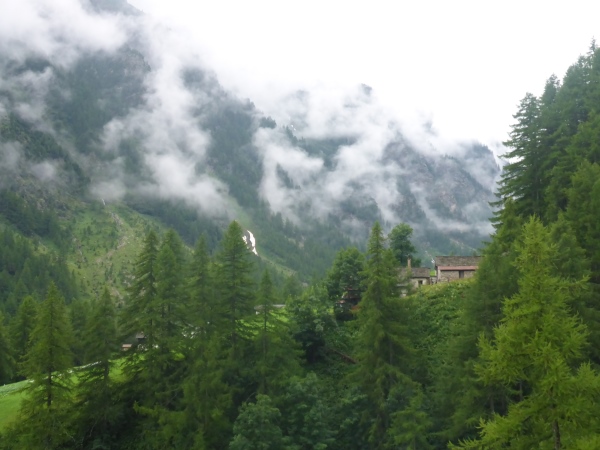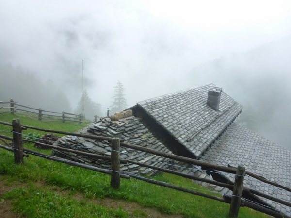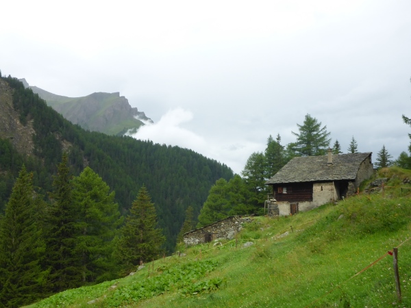 Ein paar hundert Meter weit müssen wir der Straße folgen, zum Glück nicht auf Asphalt sondern auf einem Pfad jenseits der Leitplanke. Nach der Verpflegungsstelle beim Gasthof Rothwald (km 12,7) laufen wir mehr als 200 Höhenmeter abwärts zum Tafernabach, wo wir wieder auf den Stockalperweg treffen, dem wir nun einige Stunden lang folgen können. Die Regenjacke kann ich nun wieder ausziehen, denn die Wolken über mir lichten sich. Nur von den Bergen auf der gegenüberliegenden Seite des Rhonetals sieht man jetzt gar nichts mehr. . Auch Teile unserer Aufstiegsstrecke stecken jetzt im Nebel. Da hatten wir heute Morgen Glück!
