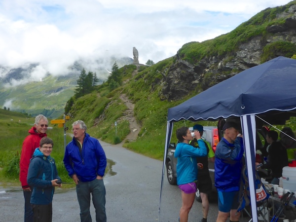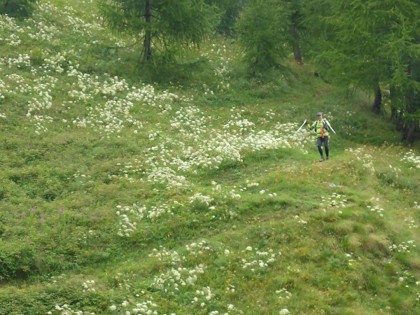 Welch herrliche Trails! Nach 500 Höhenmetern Aufstieg erreiche ich den Pass, wo Brigitte, die Chefin, das Renngeschehen überwacht. Die Wolkengrenze ist heute deutlich höher als gestern, so dass ich viel mehr Berge der Umgebung sehe. Die höchsten Gipfel stecken aber weiterhin in den Wolken.