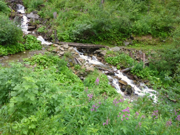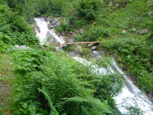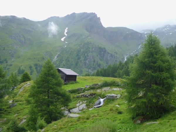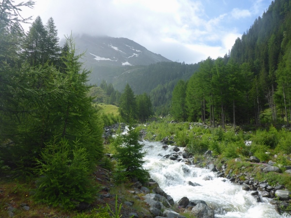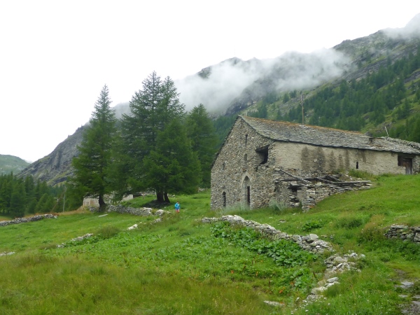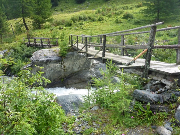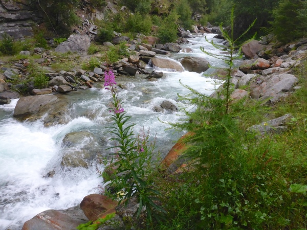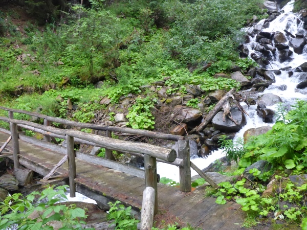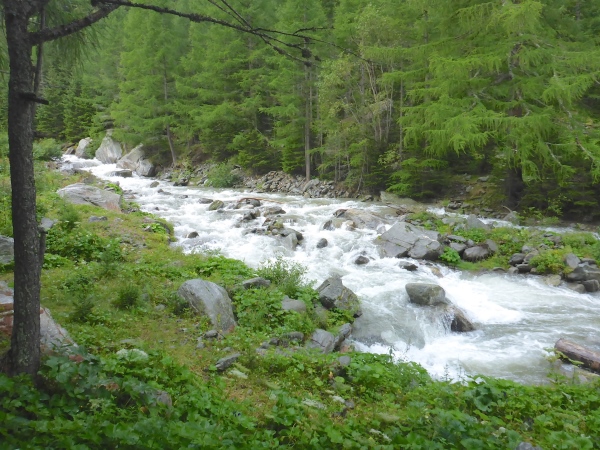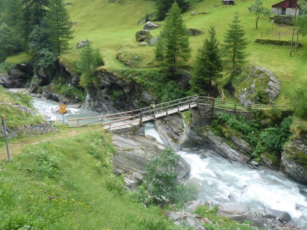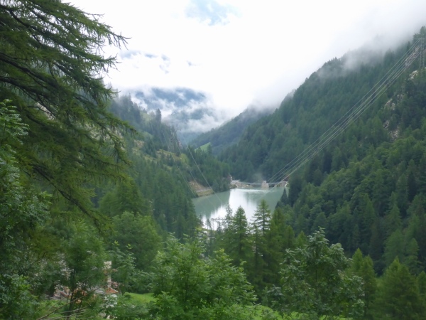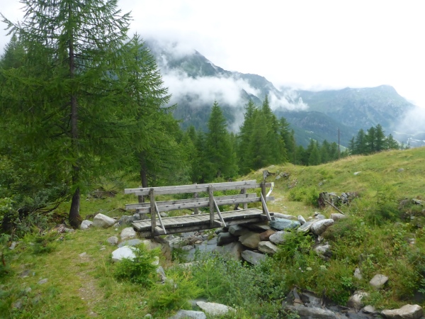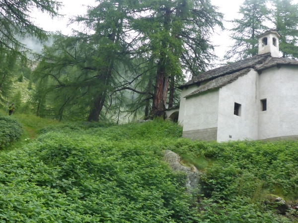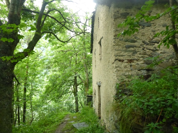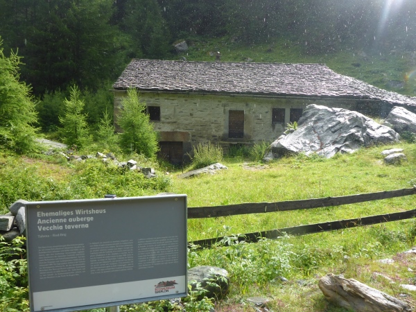 Kurz verlassen wir den Stockalperweg für eine Variante, die zur Kapelle Maria Bru führt, einem regional beliebten Wallfahrtsort. Beim kleinen Sera-Stausee liegt die letzte Verpflegungsstelle. Nun geht es durch herrliche Buchenwälder durch das Zwischenbergtal. Ende des 19. JH erlebte diese abgelegene Region einen letzten kleinen Goldrausch. Zeitweise arbeiteten bis zu 500 Menschen im Bergbau. Heute ist das Tal fast entvölkert. Nur noch etwa 100 Menschen leben hier, obwohl die Gemeinde sogar versucht, mit einem finanziellen Zuschuss das Leben hier zu fördern. Das Unwetter im Jahr 2000 zerstörte auch hier sämtliche Brücken. Inzwischen sind alle wieder aufgebaut. Unterwegs kommen wir an Relikten ehemaliger Minen und Verhüttungsanlagen vorbei.