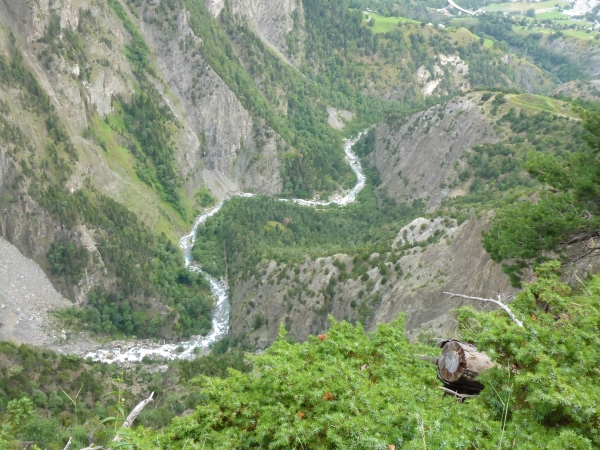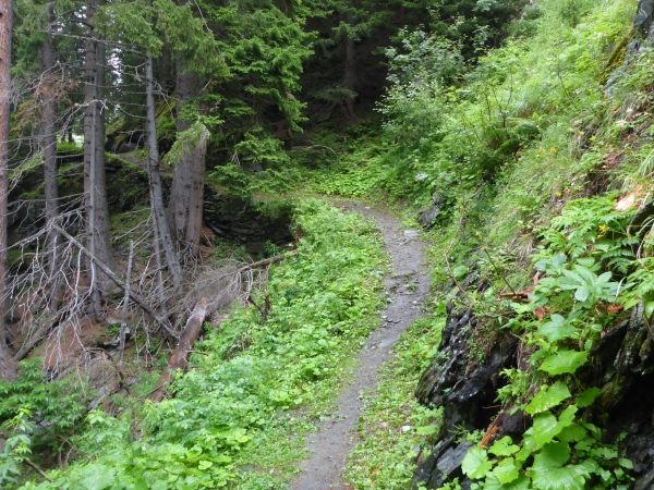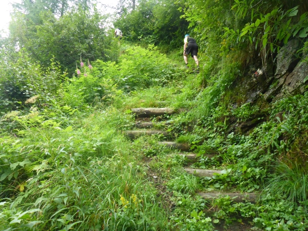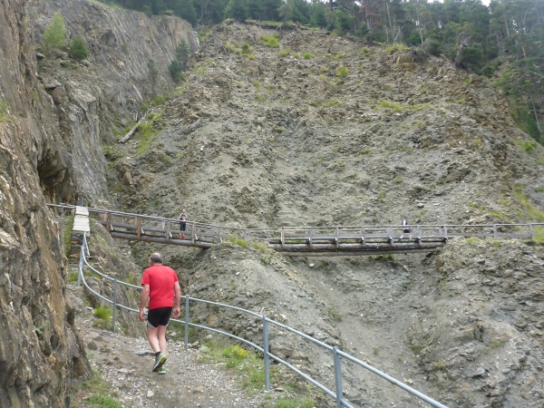 Doch zum Glück habe ich keinen Muskelkater und bin sogar besser drauf, als gestern. Daher kann ich schnell aufholen und sogar an einigen Läufern vorbei steigen. Auf einigen Abschnitten folgen wir über altes Pflaster dem Stockalperweg. Es folgt ein spektakuläres Stück, wo der Weg hoch über der Saltinaschlucht in die Felsen gehauen ist und an manchen Stellen über Stege oder Brücken an Steilhängen und fast senkrecht abfallenden Felswänden entlang führt. Der Blick in die Schlucht ist atemberaubend.