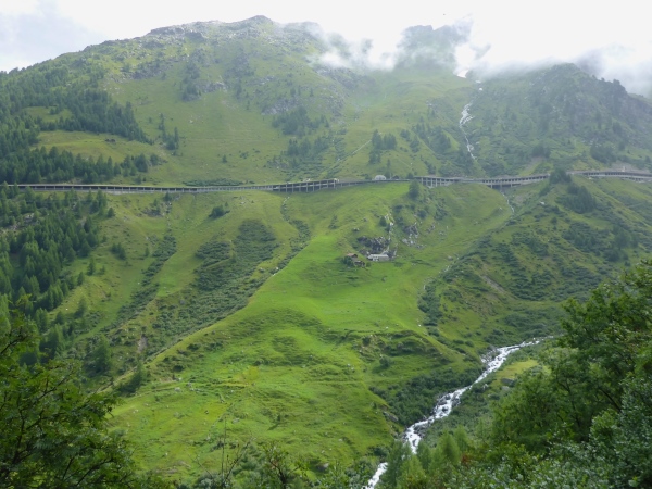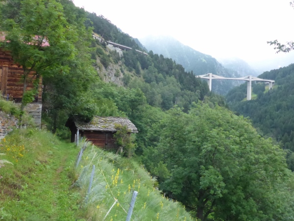 Schon nach 3,3 km erreiche ich die erste Verpflegungsstelle. Als Ultratrailer bin ich es nicht gewohnt, dass die Abstände zwischen den Verpflegungsstellen nicht zwei bis drei Stunde sind. Für einige Zeit verlassen wir nun wieder den Stockalperweg und eilen auf schnellen Trails ins Gantertal. Die markante Ganterbrücke der Simplon-Passtraße und die alte Ganterbrücke bilden einen interessanten Kontrast.