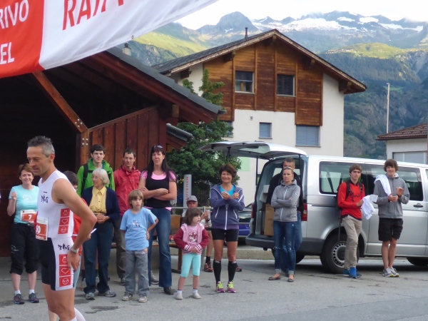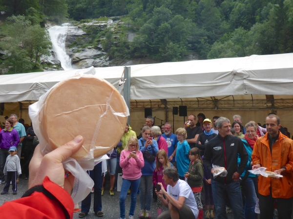 Dann gibt es die Siegerehrung. Jeder Finisher bekommt einen großen Laib Simplon-Käse. Zusammen mit dem bereits gestern erhaltenen Früchtebrot und dem Teilnehmer-Shirt sind also reich beschenkt.
