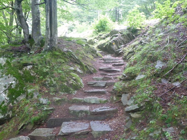 Nun geht es auf den letzten zehn Kilometern meist bergab. Am Anfang muss ich leider wieder durch Nebel laufen. Anfangs ist der Weg teilweise kniefressend steil, dann wird es für kurze Zeit flach, danach müssen wir ab und zu auf steilen Treppen bergauf steigen.