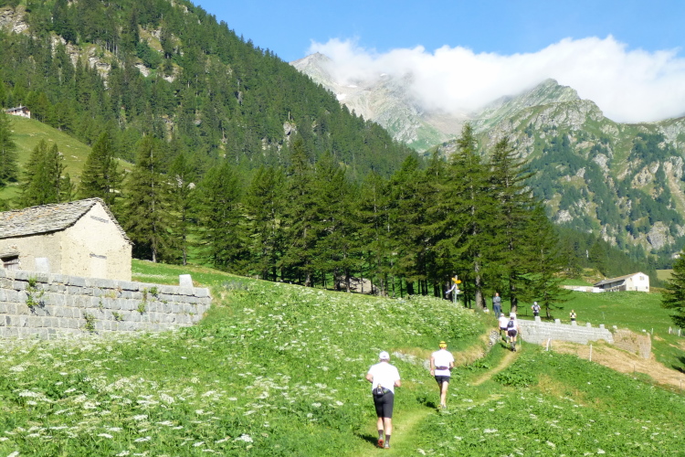 So weich der Wiesenpfad ist, so hart ist der Asphalt der alten Simplonpassstraße, die wir schließlich erklimmen. Leicht ansteigend führt sie uns direkt nach Simplon Dorf (1.472 m üNN) und, begleitet von den Anfeuerungsrufen überraschend vieler Zaungäste, mitten hinein in den beschaulichen Ortskern. Erstmals erwartet uns hier bei km 9 eine Verpflegung mit „Vollprogramm“, d.h. mit Wasser, Iso-Getränk, Cola und Bouillon sowie Energy-Riegel, Kuchen, Orangen, Apfel, Bananen, Gels. Geradezu fürsorglich gehegt und gepflegt werden die Ankommenden von den Helfern. Auch unterwegs ist das Versorgungsniveau des Gondo Marathons eine Klasse für sich.