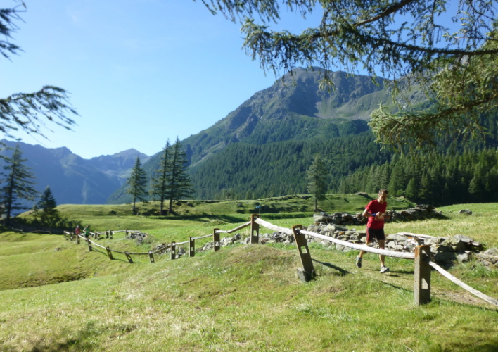 Gleich am Ortsausgang heißt es für uns: Zurück in die Natur. Über Almen hinweg gelangen wir in einen lauschigen, von großen Felsbrocken durchsetzten Lärchenwald. In stetigem Auf und Ab windet sich der wurzelige Pfad hindurch. Man muss sich konzentrieren, aber der weiche Waldboden und das abwechslungsreiche Profil machen den Trail zum Vergnügen. Der stille Weiler Egga (1.588 m üNN) ist die nächste Ansiedlung an unserem Weg. Nur eine schmale Gasse führt zwischen den niedrigen, alten Häuschen hindurch und das Plätschern des Brunnens ist das einzige Geräusch, das ich vernehme.