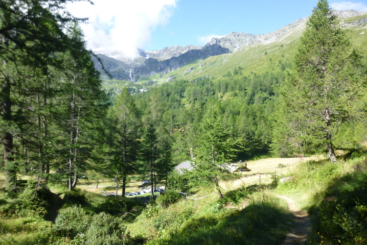 Ein schmaler, moorig-feuchter, aber mit vielen Steinen durchsetzter Pfad führt hinter Gabi durch kühlen Laubwald bergauf. Kleine Bächlein kreuzen den Weg. Auch etliche Steinstufen sind zu überwinden. Rasch gewinnen wir an Höhe. Aus dem Wald hinaus treten wir in sonnenbeschienene, saftig grüne Alpwiesen. Sanftweich ist hier der Untergrund, sehr angenehm zu belaufen. Um uns herum: Alpenidylle pur. Wenn da nicht die auf zahllosen Pfeilern getragene Simplonpassstraße wäre, die optisch wie akustisch ein wenig die Idylle trübt.