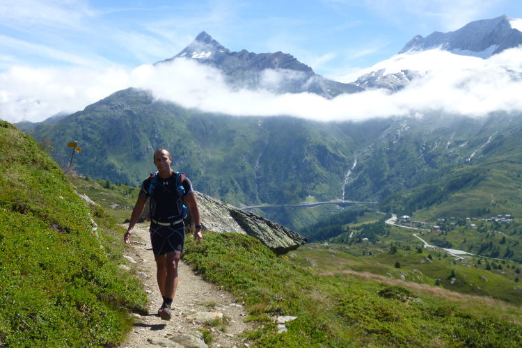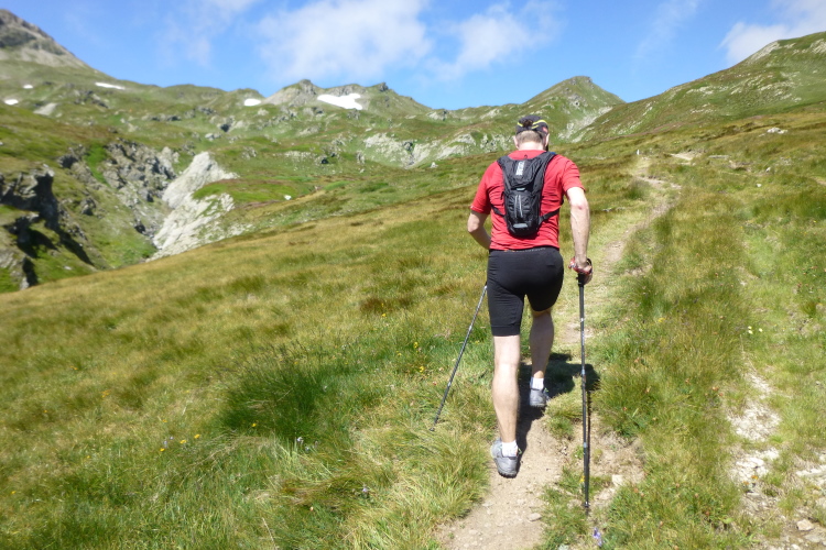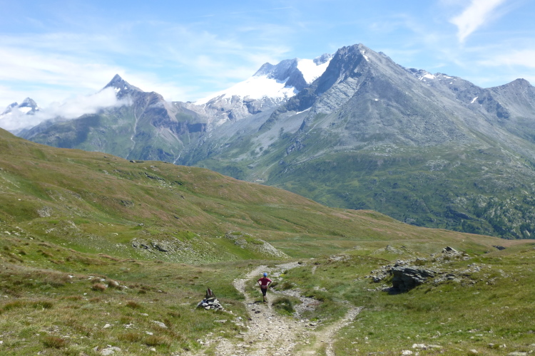 Ich folge dem markierten Bergpfad, der in die karge, weite Grassteppenlandschaft führt. Recht schnell geht es nach oben, auch wenn zwischendurch immer wieder flachere Passagen zum Wechsel vom bergmäßigen Walking zum Traben motivieren. Hinter mir baut sich ein zunehmend grandioses Gebirgspanorama auf. Weit unten erblicke ich, einsam auf der Passhöhe thronend, den wuchtigen Gebäudeklotz des 200 Jahre alten Simploner Hospizes, der aber vor dem Hintergrund der über 3.400 Meter hohen Bergmassive von Breithorn und Monte Leone zu Zwergenformat schrumpft. Ihren besonderen Kick bekommt die Kulisse durch die auf halber Berghöhe hängenden Wolkenreste.