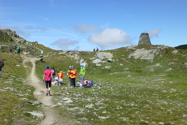 Immer weiter entfernt sich der Simplon hinter mir aus dem Blickfeld, verschwinden die Berge jenseits des Passes im grellen Gegenlicht. Die Hochgebirgsregion ist erreicht. Die Felsen werden immer kahler und schroffer, sind durchsetzt von Schneefeldern. Der Weg nimmt an Steigung zu und ich werde immer langsamer. Aber gleichzeitig lässt sich nun auch das Ende des Aufstiegs erahnen, bekommt die Passhöhe allmählich ein Gesicht. Und dann ist es auf einmal so weit. Der Weg flacht ab und wenig später erwartet mich bei km 23 die Belohnung für die Mühen: die Verpflegungsstelle auf dem Pass, am höchsten Punkt (2.417 m üNN) unserer Zweitagestour.