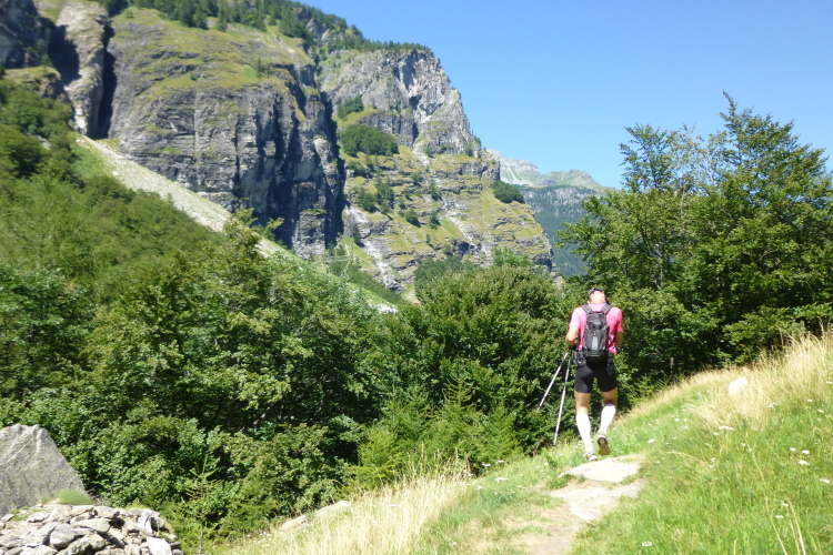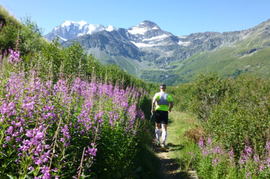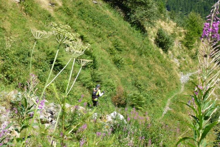 Berauschend ist einmal mehr die mächtige Bergkulisse rund um den Pass, heute gänzlich wolkenfrei und vom Sonnenlicht ausgestrahlt. Noch einmal ziehen die weiteren Highlights dieses Abschnitts an mir vorbei. Einmal mehr begeistert mich das lilafarbene Blütenmeer auf dem Weg hinab, vorbei am „Alten Spittel“. Ziemlich flott geht es über das Chrummbachtal weiter nach Egga und Simplon Dorf. Irgendwie erwarte ich den kollektiven Streik meiner Beinmuskeln, aber der will nicht kommen. Das gibt mir Hoffnung für das, was mich jenseits der Verpflegungsstelle bei km 30 nahe Gabi erwartet.