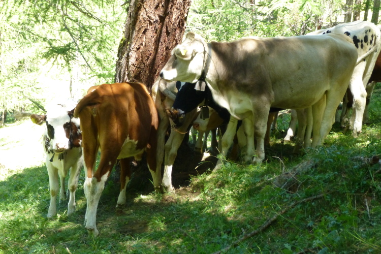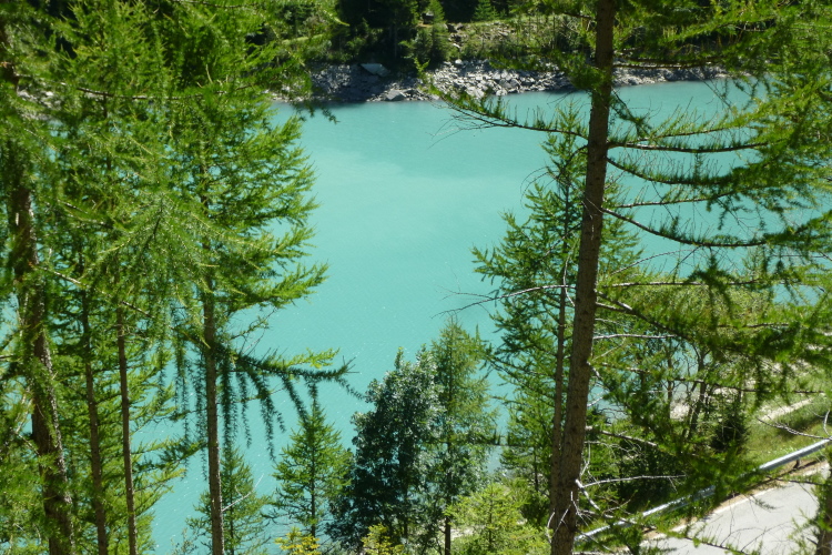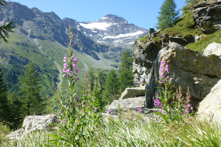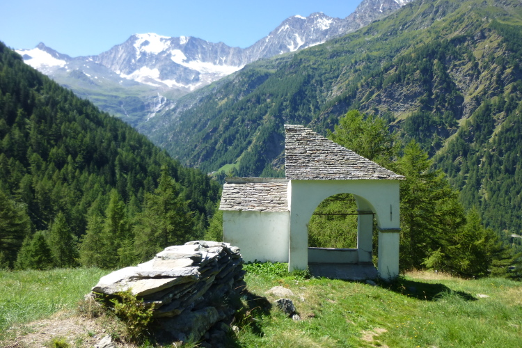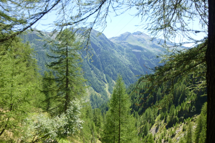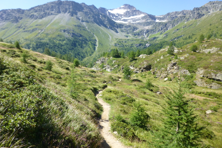 Ein besonderes Wegstück ist das nun folgende, hinab ins Zwischbergental führende. Einsam und ruhig ist es, nur das Zirpen der Grillen tönt durch die Luft. Goldgeld wiegt das hohe Gras im Wind, Wogen warmer Luft wabern hindurch. Einfach, weil steil, ist der Weg auch hier nicht, aber wie selten findet man innere Ruhe. Tief eingeschnitten liegt das scheinbar unberührte Tal vor mir, von dichtem Grün umrahmt.