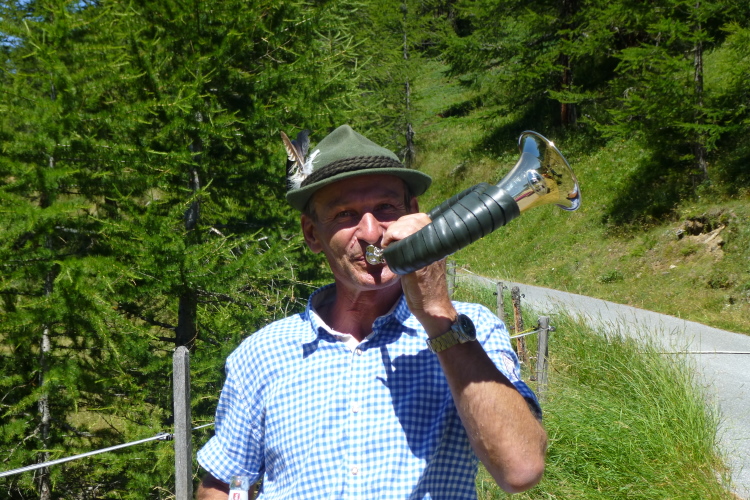 Die mentale Belohnung: Ein wunderbarer Ausblick über einsame Hütten und Kapellen tief ins Tal hinab und hoch zu den Bergen. Die erste halbe Stunde geht es mir eigentlich richtig gut, aber dann merke ich doch, wie Kraft und Lust schwinden. Ja, diese Steigung nach 72 Gesamtkilometern ist eine wahre Zumutung, aber eben auch das gehört hier dazu. Immer mehr muss ich mich überwinden, meinen Schritt zu halten, drücken die Beine und keucht der Atem. Aber dann höre ich auf einmal Trompetenklänge von oben. Ja, diese sind ein finales Motivationssignal. Denn nicht nur ein Trupp engagierter Helfer feuert jeden Ankömmling von der Passhöhe aus an, sondern auch ein persönliches Ständlein wird jedem kredenzt.