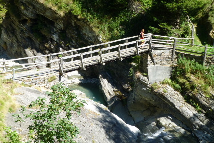 Nach 38 km haben wir diesen fast erreicht. Ein kurviger Pfad führt im Tal durch eine bizarre Berglandschaft. Ein Highlight sind die Ausblicke ins Bachbett, in dem der Bach die Felsen an seinen Ufer in fantasiereichen Formen ausgewaschen hat. Noch einmal überquere ich das Große Wasser über eine Holzbrücke, da zeigt ein Schild die Zahl „1500“ an. 1500 Meter sind es also noch bis zum Ziel. Und die sind zum Schluss nochmals richtig spannend. Denn von hier eröffnet sich durch das Blätterdach des Waldes ein besonderer Blick auf Gondo. Noch viel gewaltiger als im Ort selbst ist der Eindruck, wie sich die Häuser des Dorfes unter dem übermächtigen Fels geradezu ducken. Ängstliche Gemüter dürften schon bei diesem Anblick Beklemmungszustände bekommen.