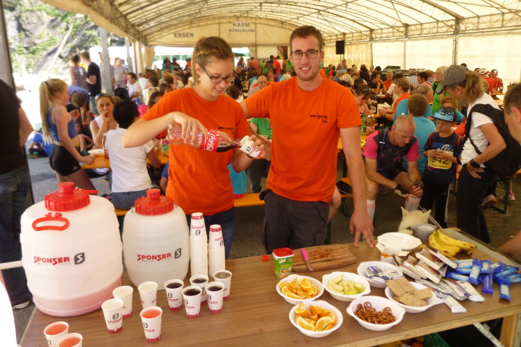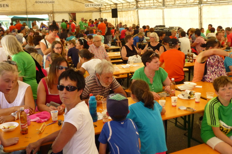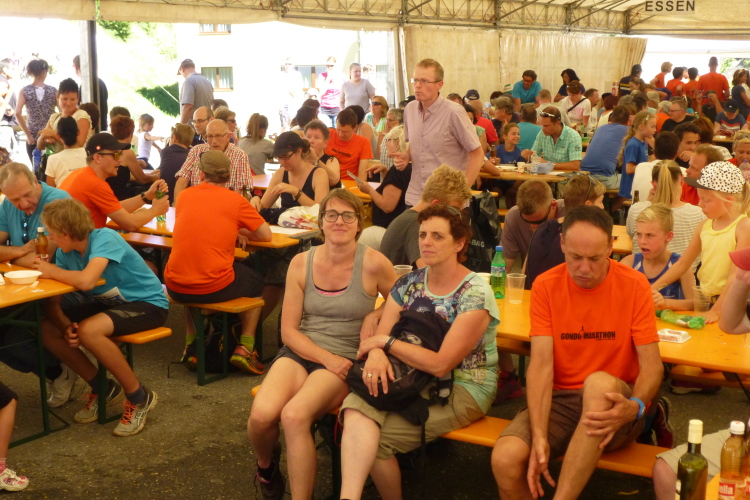 Aus der Ferne höre ich schon den Lärm und die Lautsprecherstimme vom Festplatz an der Doveria. Über steile Stufen muss ich mir noch den Weg durch das Dickicht im Abhang bahnen, ehe ich im Talgrund nach einer letzten Kurve geradewegs auf dem Festplatz einlaufe. Wie schon gestern: Der Empfang ist überaus persönlich und geradezu herzerwärmend. Glückwünsche aus allen Richtungen erwarten den Ankömmling und man ist sofort mitten im Trubel des gut gefüllten Festzelts, wo man es sich bei Bier und Grillgut gutgehen lässt.