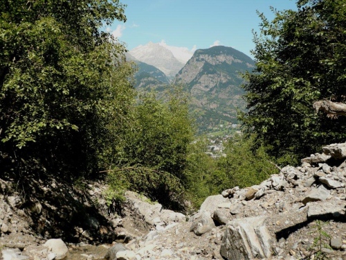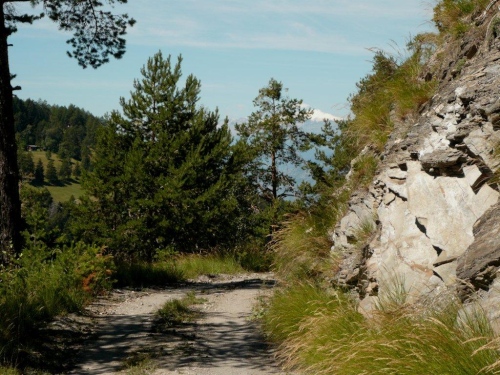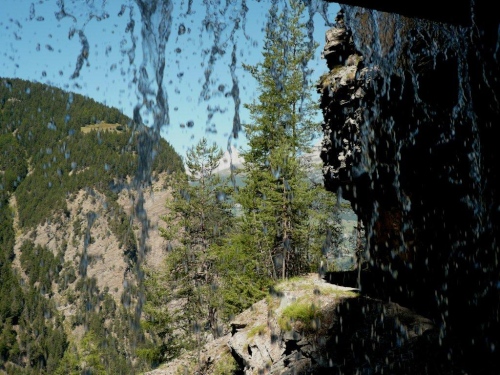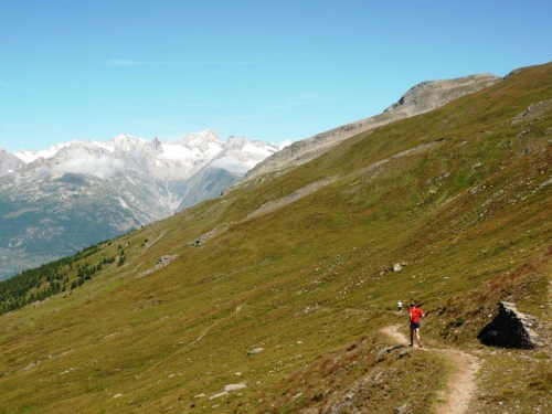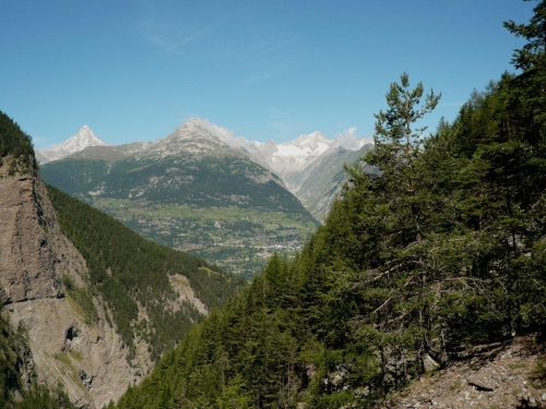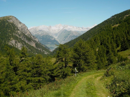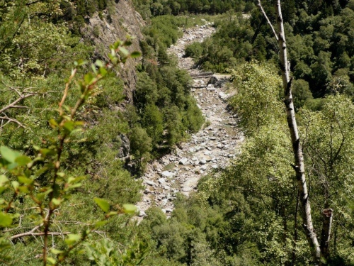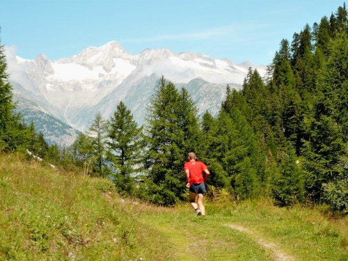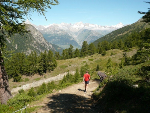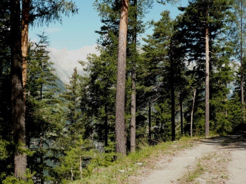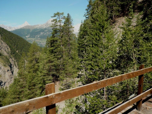 Zu zweit laufen wir weiter, doch schon bald höre ich von hinten, dass ich für mich zulaufen soll. Nach dem erneuten Wechsel der Talseite laufe ich die nächsten sechs Kilometer ohne Sichtkontakt zu anderen Teilnehmern. Bis zum Verpflegungsposten Schratt führt der Weg, bis auf einen kürzeren Abschnitt zur Einmündung ins Rhonetal, welcher als Forststraße ausgebaut ist, auf einem Trail dem Hang entlang durch den Nadelwald. Die Gewalt der Natur ist an Geländeveränderungen durch Murgänge, Schutzverbauungen und eine Holzbrücke zu erkennen, welche einem Mahnmal gleich als Totalschaden gesperrt ist, aber immer noch den Abgrund überspannt.