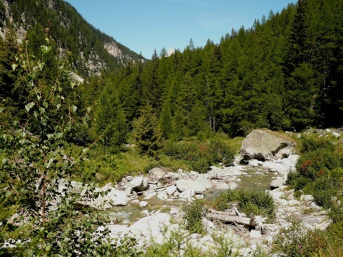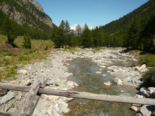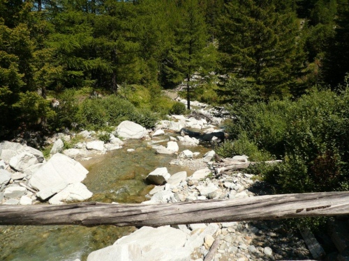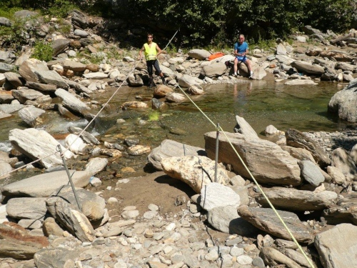 Die Querung der Saltina ist durch die Fachleute der Feuerwehr mit zwei Halteseilen bestens gesichert und überwacht. Viel Wasser führt der kleine Fluss nicht, zudem ragen einige Steine aus dem Wasser. Mit spritzigen Beinen und ohne Kamera in der einen Hand wäre es vermutlich sogar möglich, dieses Hindernis trockenen Fußes zu überwinden. Für mich gibt es also geflutete Treter und den Eindruck, als gebe es an meinen Füßen nur noch eine Reflexzone. Diejenige, die auf kaltes Wasser anspricht und direkt auf die Blase wirkt.