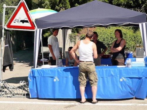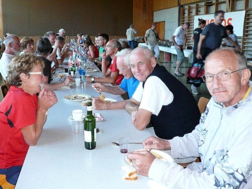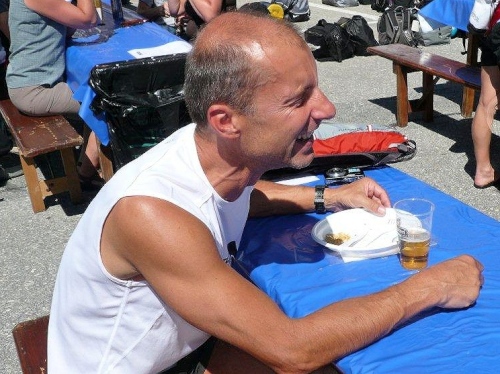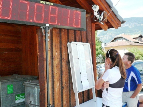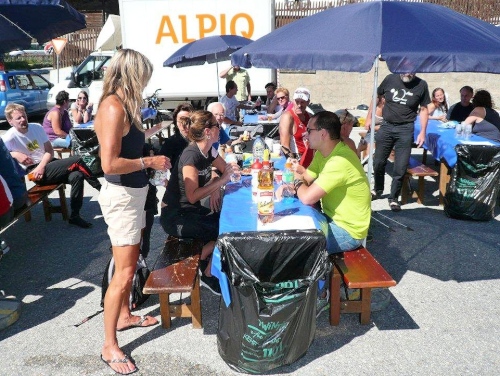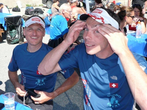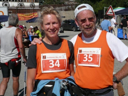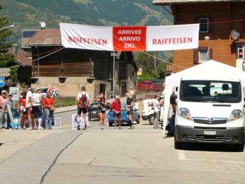 Nach dem Bezug der Unterkunft, der Zivilschutzanlage in der Mehrzweckhalle, dem Wettkampfzentrum in Ried-Brig, und einer wohltuenden Dusche setze ich mich auf dem Parkplatz zu den früher Angekommenen, die es sich auf den Festbänken bei Speis und Trank gut gehen lassen. Die Gespräche werden immer wieder unterbrochen, wenn der Sprecher einen weiteren Zieleinlauf ankündet, und das Unterqueren des Zielbanners wird mit anerkennendem Applaus bedacht.