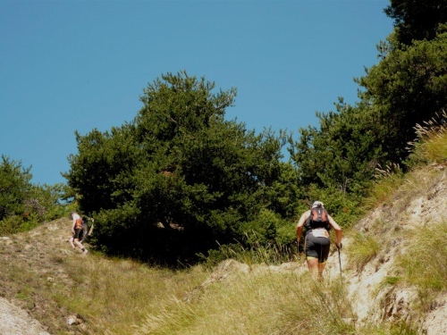 Kaum labe ich mich am Verpflegungsposten im Schatten der Bäume, kommt von hinten Anna angebraust, greift schnell zu und eilt im Sauseschritt weiter. Ich nehme dies als Ansporn, die letzten sieben Kilometer nicht zu bummeln, und versuche ihr zu folgen. Bis endlich ein Abschnitt mit mehreren Gegensteigungen kommt, ist das auf dem abschüssigen Weg ein ziemlich hoffnungsloses Unterfangen.