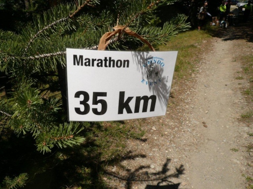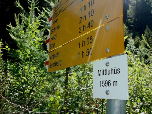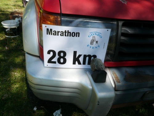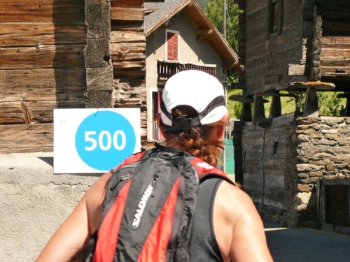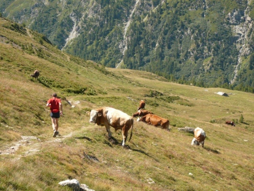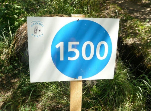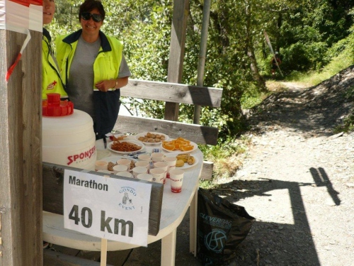 Trotz der zwischenzeitlichen Verlangsamung - in diesem Falle gehen meine Schuldzuweisungen auf eine Kuhhaut, ja sogar auf mehrere - sind die 600 Höhenmeter bis auf den Talboden schnell abgebaut. Kurz nach der Überquerung der Gamsa taucht schon der nächste Verpflegungsposten mit dazugehörendem Kilometerschild auf. Zwei Drittel der Distanz liegen hinter uns, ebenso die meisten positiven Höhenmeter. Abgesehen vom Schlussfeuerwerk warten auf dem letzten Drittel nur unwesentliche Gegensteigungen, der Rest ist Gefälle.