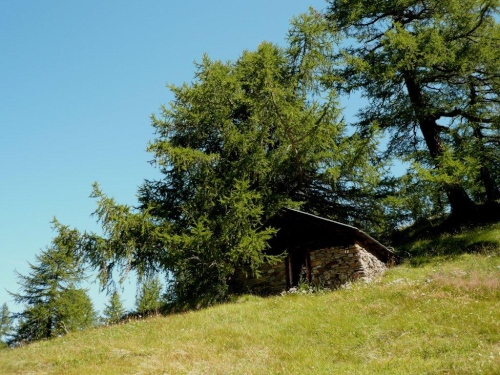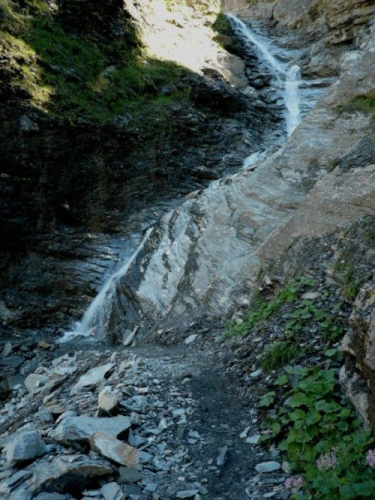Ich bekämpfe Gleiches mit Gleichem und schütte am letzten Verpflegungsposten erst recht nochmals zwei Becher in mich hinein, danach hefte ich mich wieder an die Fersen von Anna, die trotz Krämpfen bei der Wassertreterei den Schwung des letzten Abstiegs mit auf die letzten zwei Kilometer nimmt. Der lauschige Weg entlang einer Bisse ist nicht lang, dann müssen wir rechts hoch, um noch einen Hauch Wüstenmarathon mitzunehmen. Zum Glück ist trotz des strahlend blauen Himmels die Temperatur moderat. Dieses kurze Stück wäre sonst, so wie es der Sonne ausgesetzt ist, höllisch heiß. Auch bei den jetzigen Verhältnissen ist die Wärmebelastung über der Komfortzone.