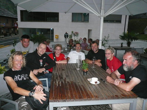 Freitag abend: Pastaparty, Blick aus dem Turmfenster auf die regennasse Zollstation. Bezug der Unterkünfte im Bunker, wo mächtige Lüftungsmaschinen geräuschvoll arbeiten. Ob im Bunker oder oberirdisch, unter den Felsen, die keinen Sonnenstrahl ins Tal lassen: Wer Platzangst hat, der stirb hier. Es gibt eine Alternative zum Bunker, doch auch da schläft man mit 20 Leuten in einem Raum. Unsicherheit im Kopf, letztes Bier unter den Schirmen vor dem Turm, Wasserkaskaden rauschen über die Passstrasse, 1 kg Früchtebrot gefuttert (gab´s mit Schultertasche, T-shirt und Thermengutschein mit den Startunterlagen), schlafen gegangen.
