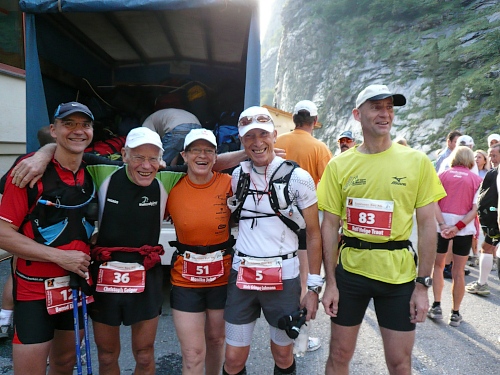 Kurz wird der Verkehr auf der Strasse angehalten, 126 fitte Ultraläufer brauchen nicht lange, um den Weg hinaufzujagen. Hinter den Tankstellen von Gondo (840 ü.M.) geht es gleich in die imposante Gondoschlucht. Unter uns die Passstrasse. Wir laufen auf dem Stockalperweg, dem Weg, der im 17.Jahrhundert als Handelsweg angelegt wurde.