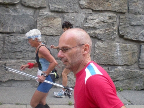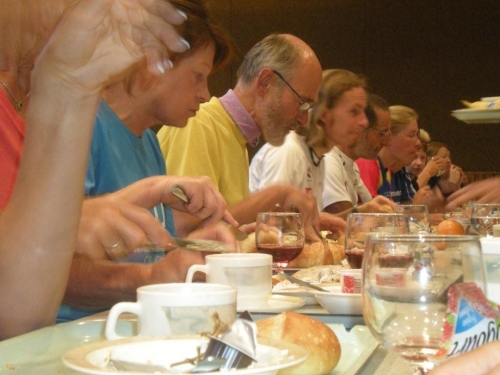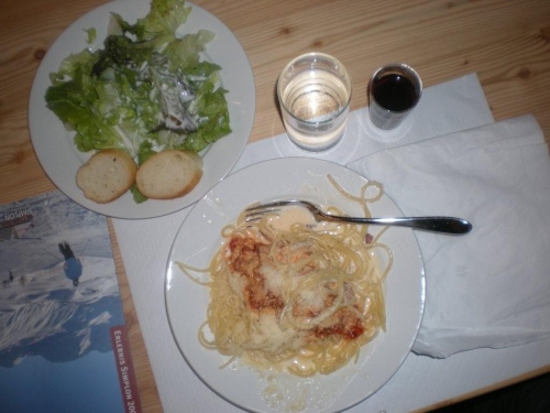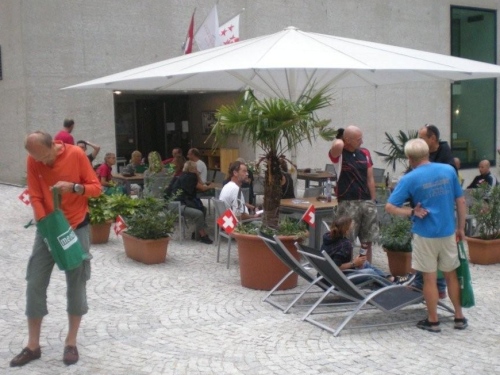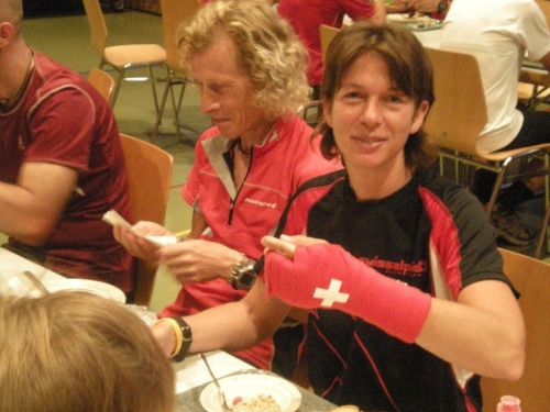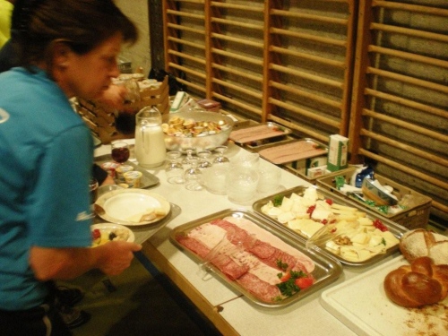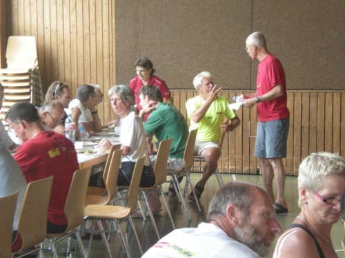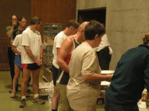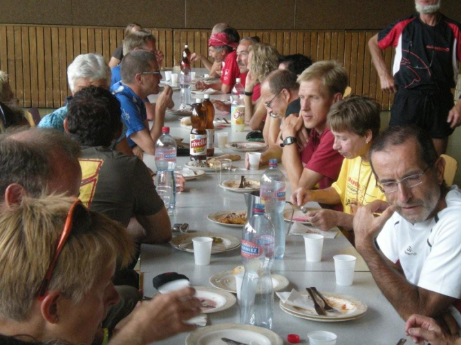 Im Nu vergeht die Zeit und es ist schon wieder Zeit fürs Nachtessen. Ein Salatbuffet, Reis und Teigwaren mit verschiedenen Saucen und Piccata Milanese werden uns aufgetischt, schmackhaft und von allem reichlich. Der warme Sommerabend zieht viele nach dem Nachtessen wieder nach draußen und so sind die Terrassen und Gärten der umliegenden Restaurants bald von munter plaudernden Läufern bevölkert.