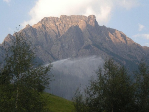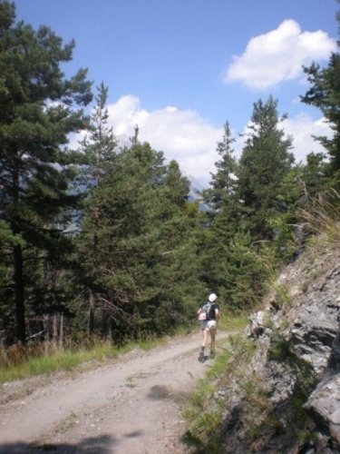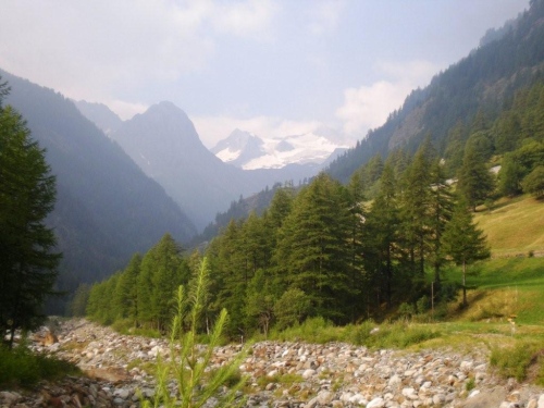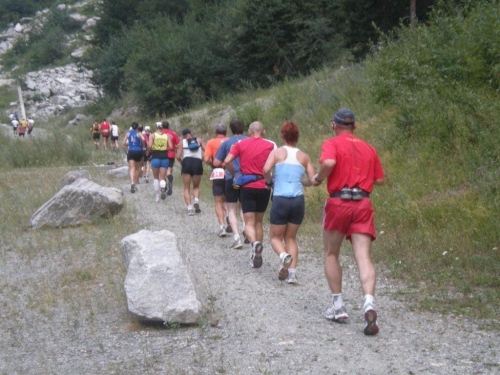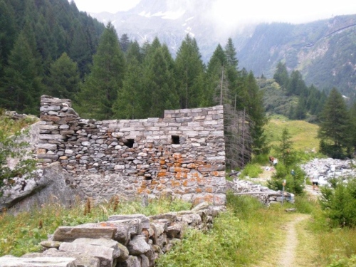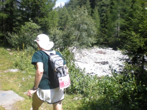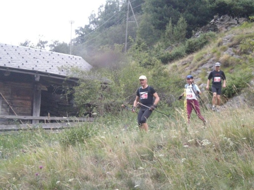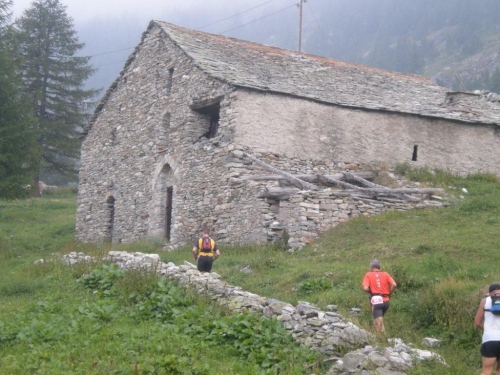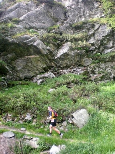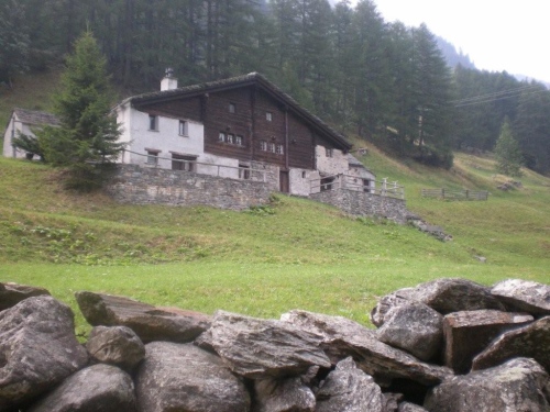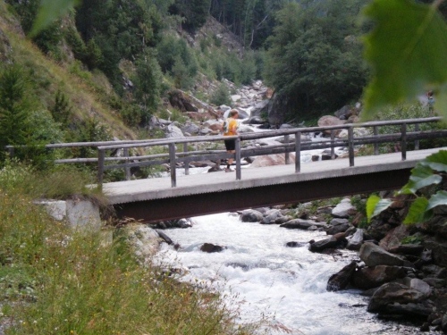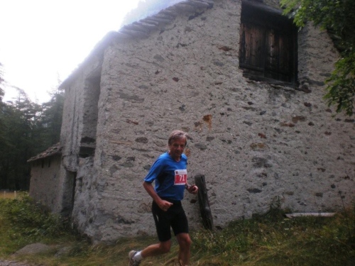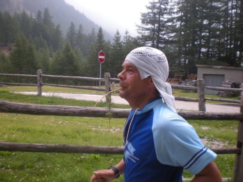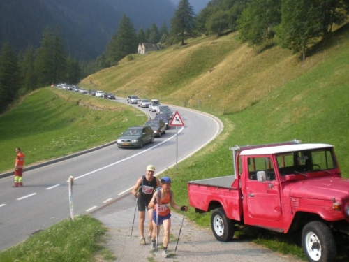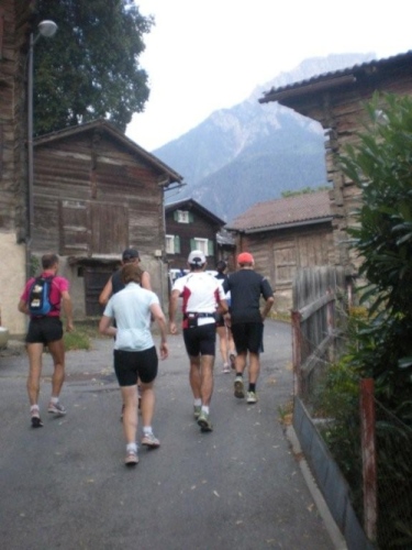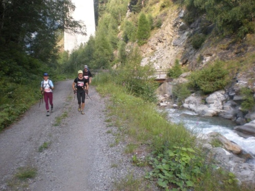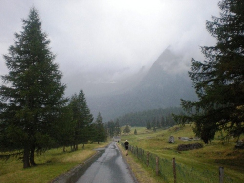 Die Enttäuschung über den Rennabbruch steht auch den nachfolgenden Läufern ins Gesicht geschrieben. Aus diesem Grund entscheiden wir uns, nicht in dem spontan zur Verfügung gestellten Chalet auf ein angefordertes Taxi zu warten, sondern auf der sicheren Straße, auf welcher noch Reste des Hagelschauers liegen, hinunter ins Zwischbergental nach Gondo zu laufen. Es ist zwar ein gehöriger Umweg, denn die Straße führt weit hinten ins Tal, bevor eine Spitzkehre uns endlich in Richtung Ziel leitet. Aber so bleiben wir schön warm und unterwegs kommt uns dann auch das Taxi entgegen. Wir verzichten aber einzusteigen und nochmals aufs Furggu hochzufahren und laufen im Regen weiter.
