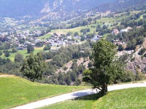 Ein kurzes Stück noch durch den Wald – immer brav aufwärts – und dann kommt das Schild mit dem Hinweis, dass es nur noch 1500m bis ins Ziel sind. In der Mittagshitze nehme ich es auf der Straße hinein nach Ried-Brig gemütlich. Jedes Quäntchen Energie, das ich hier nicht verspiele, könnte morgen vielleicht den Unterschied machen.