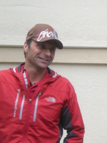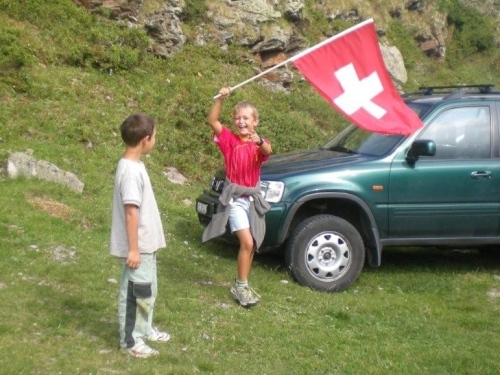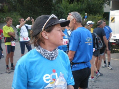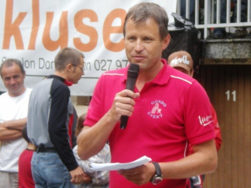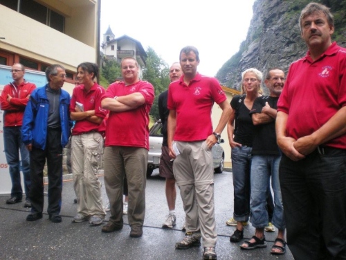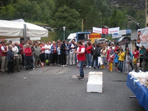 Beim Briefing vor dem Start kann uns Brigitte Wolf mitteilen, dass sich auch die Wetterbedingungen an unsere Wünsche halten werden. Die Atmosphäre vor dem Start ist ruhig, friedlich und entspannt. Nichts von nervösem hektischem Getue und Drängeln um die besten Startplätze. Jeder Anwesende weiß, auf was er sich da einlässt und dass heute erst die erste Fuhre in die Scheune gebracht wird. Der Gemeindepräsident hält stolz die große Walliser Fahne, als wir auf die Reise geschickt werden.