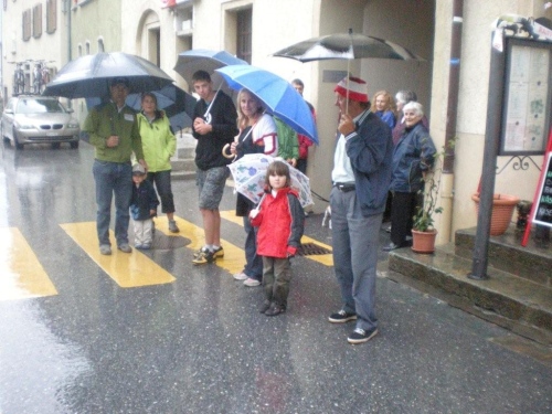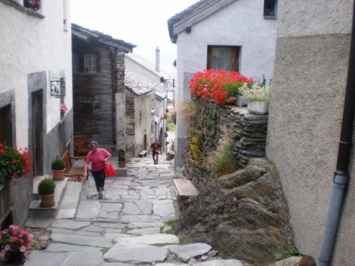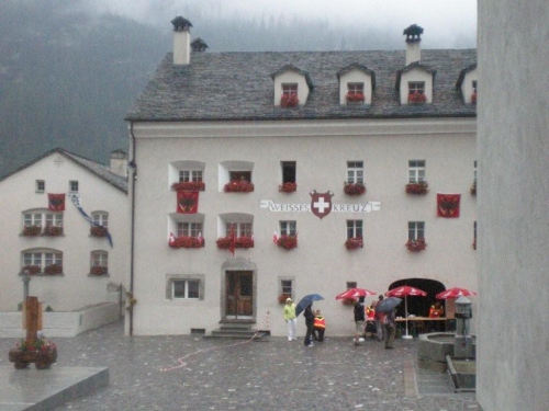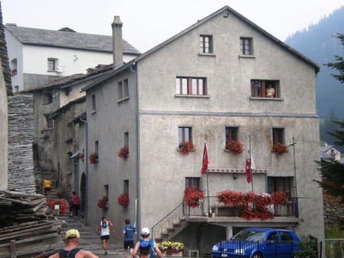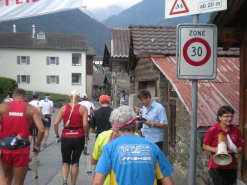 Mit dem starken Regen in den Augen, habe ich eingangs Simplon-Dorf kleine Orientierungsschwierigkeiten. Obwohl es erst 24 Stunden her ist, dass ich hier vorbeikam, kann ich mich nicht mehr erinnern, welchen Weg ins Dorf ich nehmen muss. Vom Balkon eines Hauses bekomme ich Lotsendienst und ziehe weiter. Trotz strömenden Regens stehen Zuschauer an der Straße und feuern mich an.