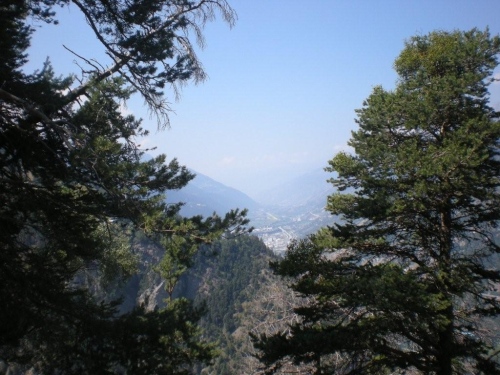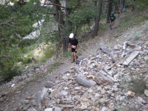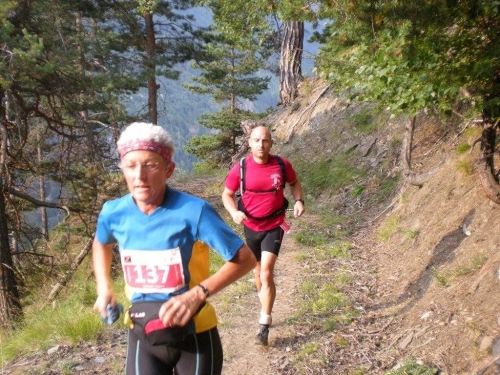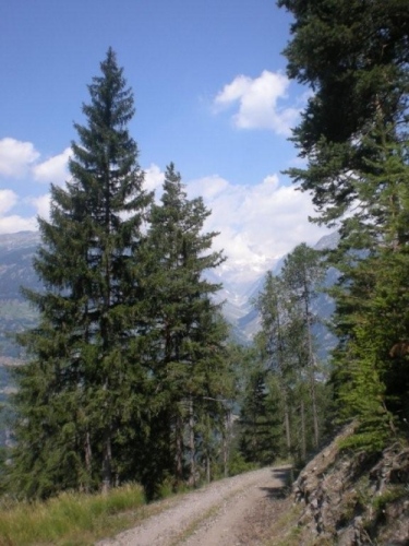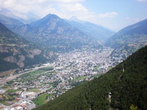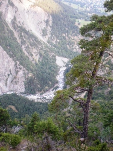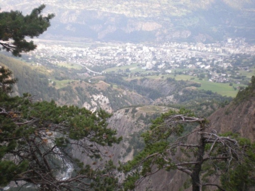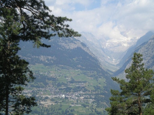 Dass mir die sieben Kilometer bis zum nächsten Verpflegungsposten so lang vorkommen, liegt vermutlich an der eindrucksvollen Strecke. Neu erfrischt und mit einem Ausblick das Rhonetal in Richtung Sprachgrenze und hinab aufs nahe Brig geht es auf die letzten sieben Kilometer. Mittlerweile ist die Sonne kräftig zu spüren und ich bin dankbar für die vielen Bäume, die mir Schatten spenden. Auf diesem Abschnitt unterhalte ich mich mit Grainne aus Dublin, die ebenfalls vor einer Woche am K78 teilgenommen hat. Für sie – wie für zahlreiche andere Teilnehmer auch – ist das Gondo Event eine weitere Vorbereitung auf Chamonix.