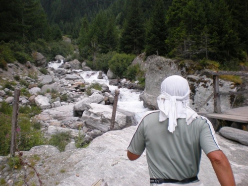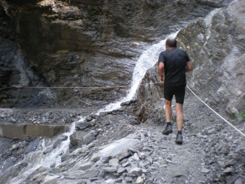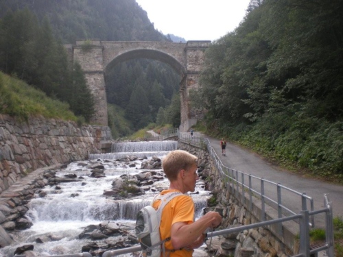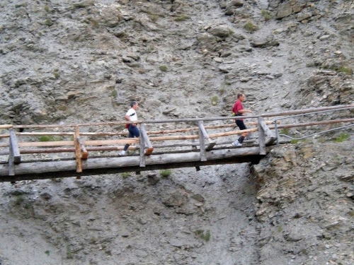 Leider fällt das Kampfkneippen heute aus, offenbar ist die Strömung zu stark, als dass die Feuerwehr es vertreten könnte, uns durch diesen Wildbach zu führen. Wem die Getränke am Verpflegungsposten nicht reichen, der kann sich nach der Brücke gleich in die Suone legen… Nachdem er sich schon unter einem Wasserfall geduscht hat, wählt Markus auch diese Option.