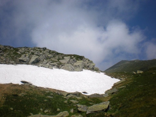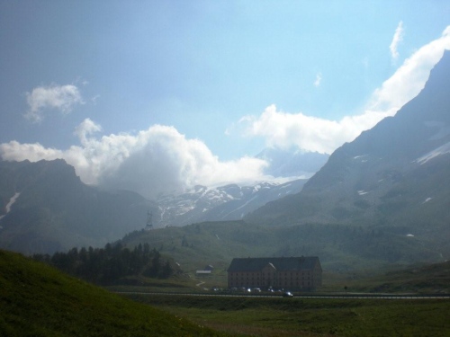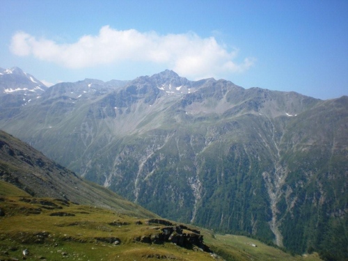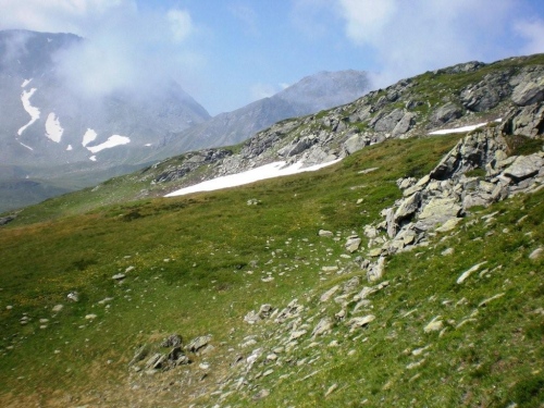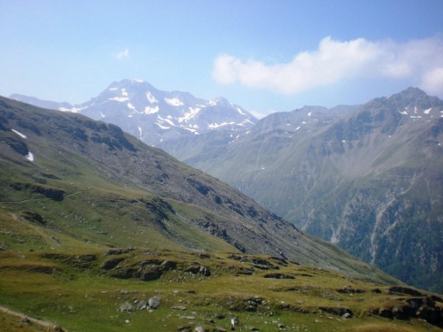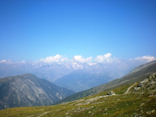 Die Temperatur auf 2000m Höhe ist immer noch ganz angenehm und da sich die Sonne mittlerweile gegen die Wolken weitgehend durchgesetzt hat, ist zu erwarten, dass sich daran bis zum nächsten Teilziel, dem nochmals vierhundert Meter höher gelegenen Bistinenpass nicht viel ändern wird. Nur den Blick zurück aufs Massiv des Monte Leone versperren ein paar sich hartnäckig an der Bergflanke festgekrallte Wolken und das Simplonhospiz versteckt sich davor im Widerlicht der Morgensonne.